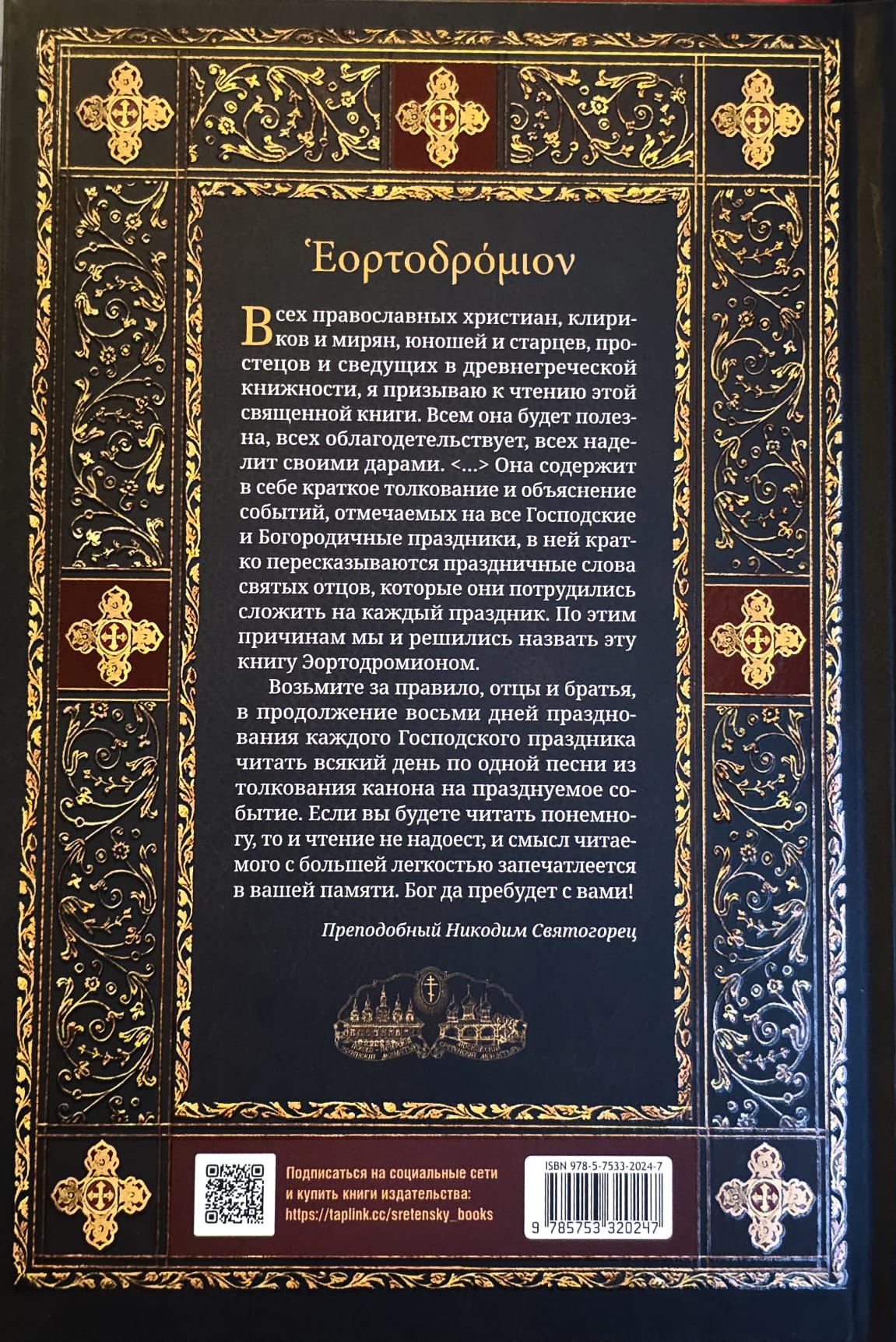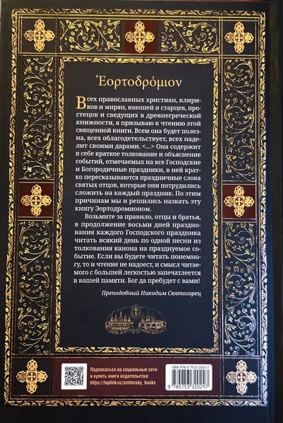 «Эортодромион», в буквальном переводе с греческого языка «шествие по праздникам», представляет собой сборник толкований прп. Никодима Святогорца на праздничные каноны, которые созданы свв. Иоанном Дамаскиным и Космой Маюмским в VIII в. и до сих пор употребляются в литургической практике нашей Церкви. Работая над этими толкованиями, прп. Никодим, один из величайших богословов и учителей Греческой Церкви XVIII-XIX вв., вложил в них всю свою любовь к православному богослужению и святоотеческому слову.
