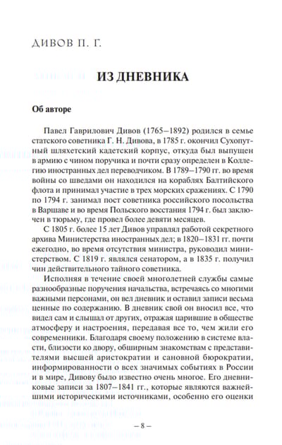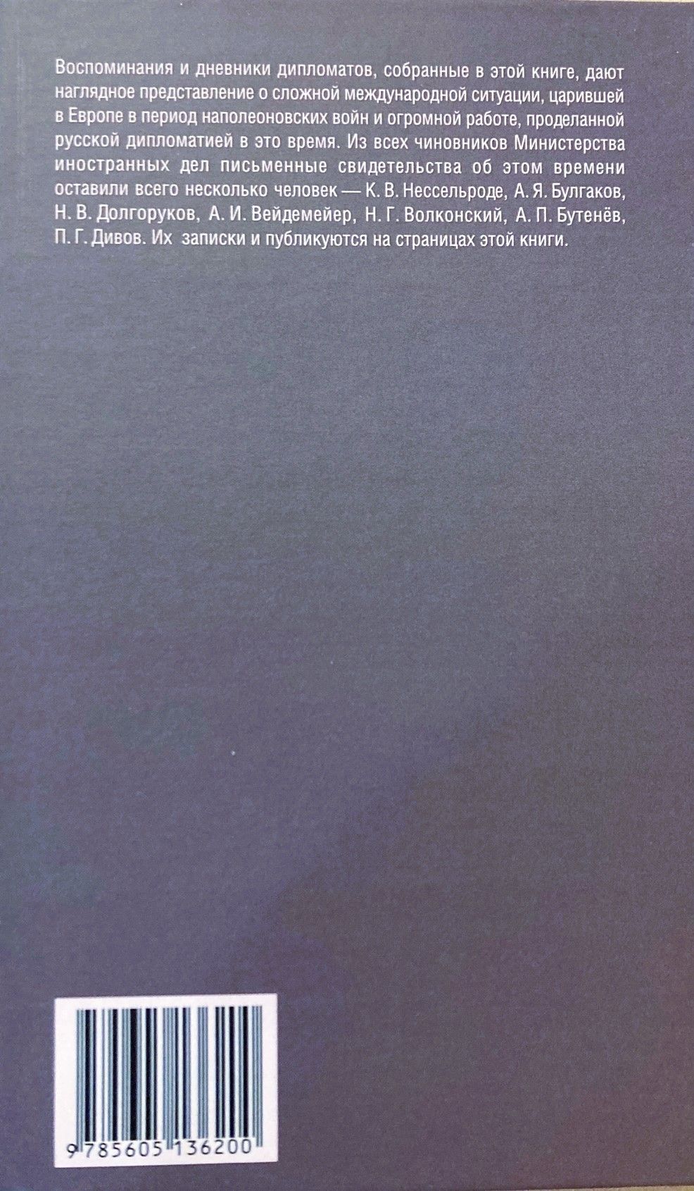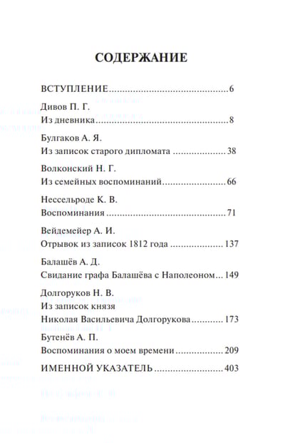 В этой книге собраны воспоминания и дневники дипломатов эпохи наполеоновских войн. Из всех чиновников Министерства иностранных дел письменные свидетельства об этом времени оставили всего несколько человек, имевшие к тому же разный статус. К. В. Нессельроде, А. Я. Булгаков, Н. В. Долгоруков и А. И. Вейдемейер были секретарями разных заграничных посольств, генерал-адъютант А. Д. Балашёв и флигель-адъютант князь Н. Г. Волконский выполняли военно-дипломатические миссии, А. П. Бутенёв находился в центральном ведомстве и в 1812 г. был прикомандирован ко 2‑й Западной армии в качестве дипломатического чиновника, П. Г. Дивов занимал пост начальника секретного архива МИД.