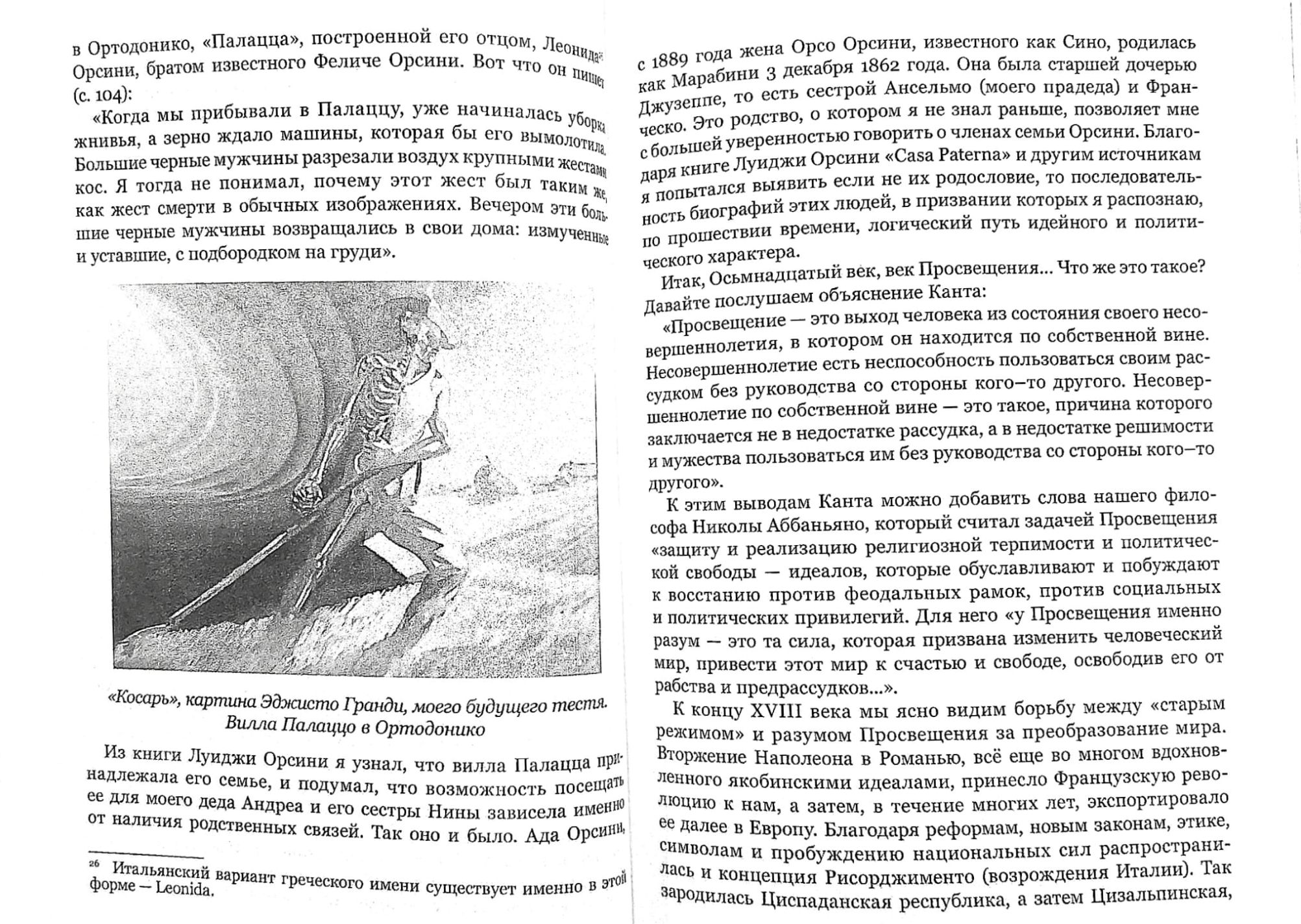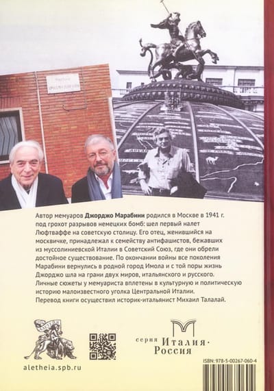 Автор мемуаров Джорджо Марабини родился в Москве в 1941 г. во время разрывов немецких бомб: шел первый налет Люфтваффе на советскую столицу. Его отец, женившийся на москвичке, принадлежал к семейству антифашистов, бежавших из муссолиниевской Италии в Советский Союз, где они обрели достойное существование. По окончании войны все четыре поколения Марабини вернулись в родной город Имола и с той поры жизнь Джорджо шла на грани двух миров, итальянского и русского. Личные сюжеты у мемуариста вплетены в культурную и политическую историю малоизвестного уголка Центральной Италии.