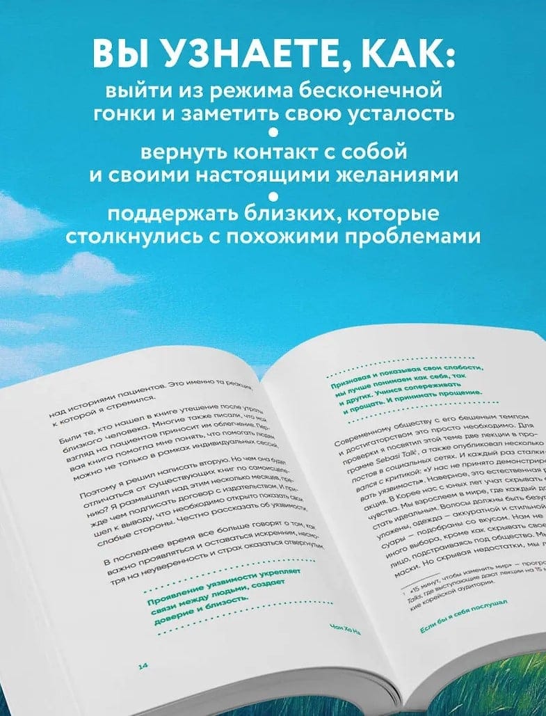 «Если бы я себя послушал» — честный разговор о тревоге, выгорании и жизни в режиме постоянной гонки. На Чон Хо, практикующий психиатр и автор бестселлера в Корее, делится историями пациентов и рассказывает о своей борьбе с тревожным состоянием. В книге автор объясняет, как мы теряем контакт с собой, почему боимся показывать свои слабости и годами не разрешаем себе остановиться.