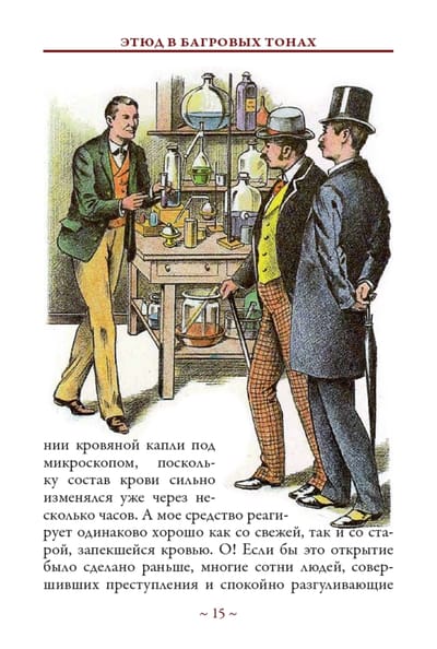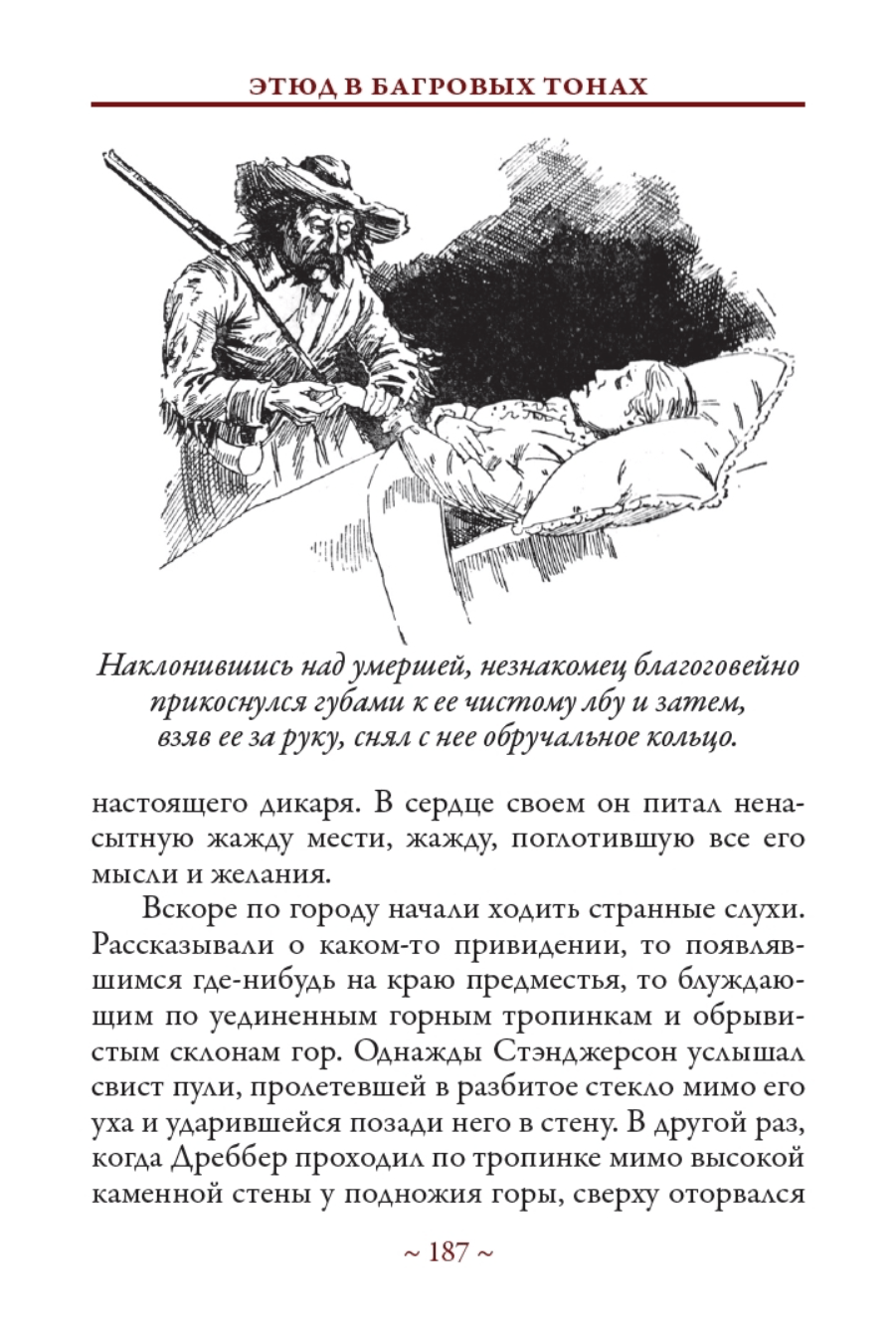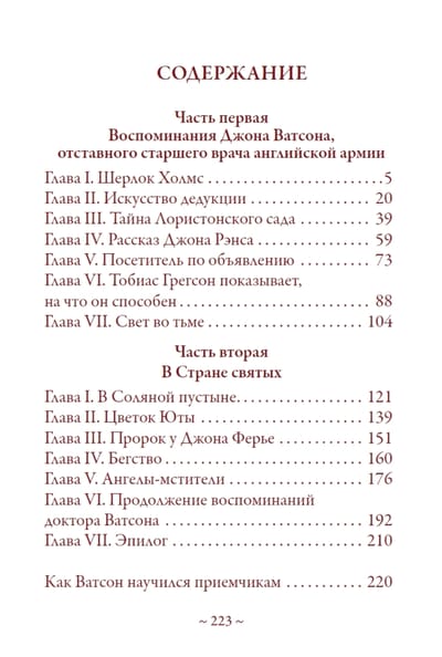В сборник вошла повесть «Этюд в багровых тонах», являющаяся первым произведением Артура Конан-Дойла о знаменитом сыщике Шерлоке Холмсе и его друге докторе Ватсоне, и не входящий в каноническое собрание рассказов о знаменитом сыщике рассказ-пародия «Как Ватсон научился приемчикам», написанный Конан-Дойлем специально для библиотеки Кукольного домика королевы Марии.