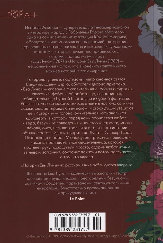 Исабель Альенде — суперзвезда латиноамериканской литературы наряду с Габриэлем Гарсиа Маркесом, одна из самых знаменитых женщин Южной Америки, обладательница многочисленных премий, автор книг, переведенных на десятки языков и выходящих суммарными тиражами, которые неуклонно приближаются к ста миллионам экземпляров. «Ева Луна» (1987) и «Истории Евы Луны» (1989) — ее ранние книги о том, что в конечном счете ничего важнее историй в этом мире нет. Генералы, ученые, партизаны, непризнанная святая, бандиты, хозяин цирка, обитатели дворца-призрака… «Ева Луна» — сказание о сказительнице, роман о сиротке, служанке, фабричной работнице, сценаристке, обладательнице бурной биографии и буйной фантазии. Ради всего человеческого, что есть в ней и в нас, она сочиняет сказки, мешает правду с вымыслом, и страждущих утешают ее «Истории» — головокружительная карнавальная круговерть, в которой перед нами проносятся любовь и вера, безумные совпадения и неистовые страсти, много печали, смех, немало крови и все то, из чего истории обычно состоят. Здесь говорит Ева Луна — Оливер Твист, Шахерезада и барон Мюнхгаузен, трикстер, подводный камень, проницательная свидетельница, которая протянет руку помощи или просто, одарив любопытным взглядом, запомнит, сохранит память и потом расскажет о том, что видела.