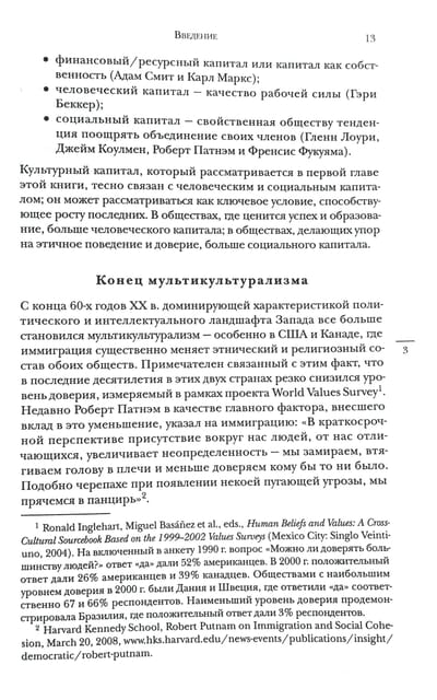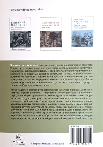 В книге исследуется влияние культуры на экономическое развитие. Изложение строится на основе введенного автором понятия «культурного капитала» и предложенной им и его коллегами типологии культур, позволяющей на основе 25 факторов определить, насколько высок уровень культурного капитала в той или иной культуре. Наличие или отсутствие культурного капитала определяет, создает та или иная культура благоприятные условия для экономического развития и социального прогресса или, наоборот, препятствует им.