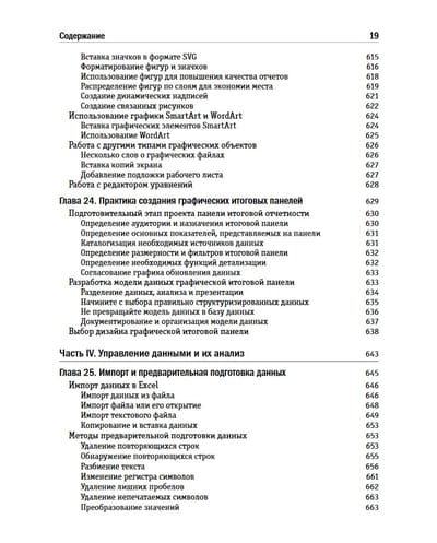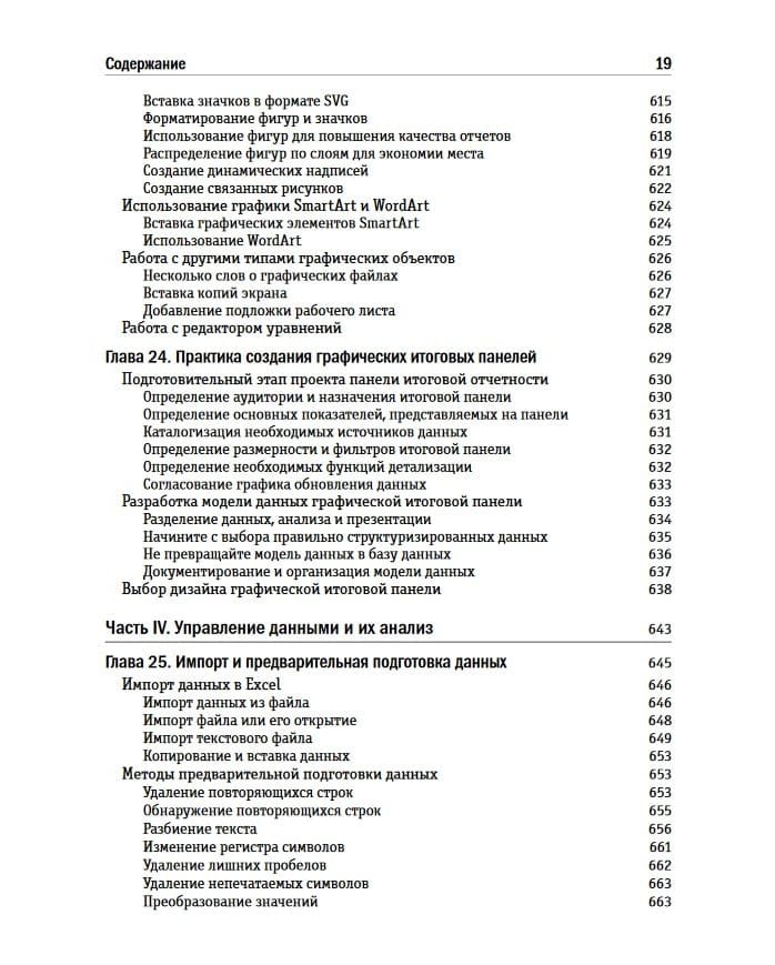 Узнайте о новинках в Excel 2019 и освежите в памяти основы - ячейки, формулы, функции, диаграммы. Научитесь обрабатывать данные всеми доступными способами, включая импорт, структурирование, консолидацию и анализ. Овладейте такими полезными средствами Excel, как условное форматирование, спарклайны, автозаполнение, пакет анализа и надстройка Power Query. Откройте для себя аналитическую мощь сводных таблицы и модели данных Power Pivot. Создавайте свои VBA-макросы, добавьте на рабочие листы элементы управления и попробуйте работу с событиям Excel. Для получения необходимых навыков поработайте с файлами рабочих книг с примерами, которые можно загрузить с веб-сайта этой книги.