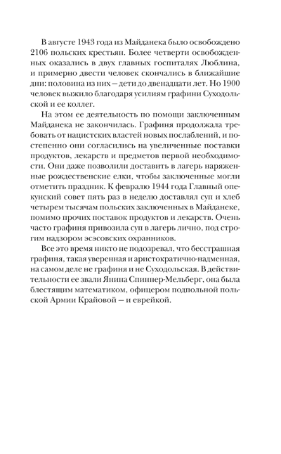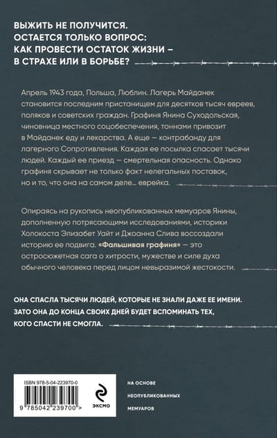Опираясь на рукопись неопубликованных мемуаров Янины, дополненную потрясающими исследованиями, историки Холокоста Элизабет Уайт и Джоанна Слива воссоздали историю ее подвига. «Фальшивая графиня» — это остросюжетная сага о хитрости, мужестве и силе духа обычного человека перед лицом невыразимой жестокости.