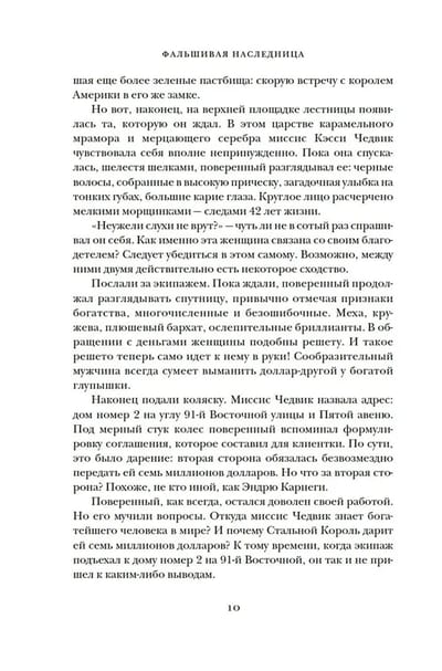 Элизабет Бигли, уроженка маленького городка в канадской провинции, в юном возрасте открыла в себе талант к убеждению и хитроумным выдумкам. Именно благодаря этой способности она станет одной из самых известных аферисток в истории. Меняя имена и придумывая новые уловки, Кэсси Чедвик смогла прожить 14 лет за счет кредитов, которые подкрепляла поддельными векселями, очаровывала одного банкира за другим и убеждала всех вокруг, что она дочь знаменитого Эндрю Карнеги. Книга писательницы Энни Рид рассказывает одну из самых захватывающих историй о жизни американского общества конца XIX века.