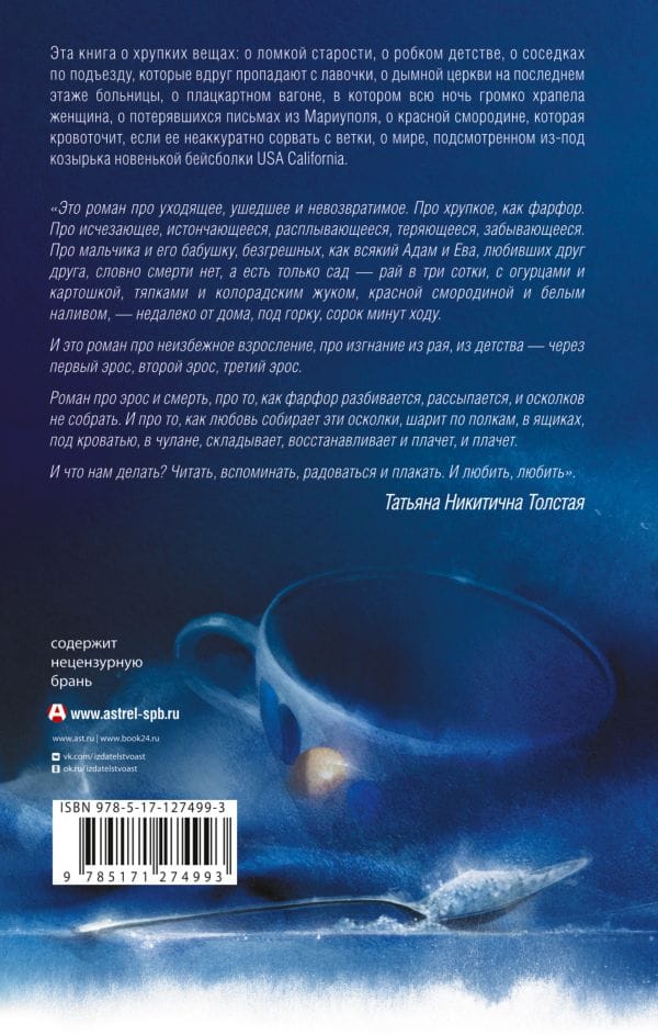 Эта книга о хрупких вещах: о ломкой старости, о робком детстве, о соседках по подъезду, которые вдруг пропадают с лавочки, о дымной церкви на последнем этаже больницы, о плацкартном вагоне, в котором всю ночь громко храпела женщина, о потерявшихся письмах из Мариуполя, о красной смородине, которая кровоточит, если ее неаккуратно сорвать с ветки, о мире, подсмотренном из-под козырька новенькой бейсболки USA California.