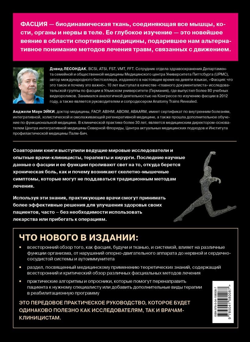 Наша фасциальная система, включающая как плотные волокнистые слои, так и более слабо организованный поверхностный слой, защищает и поддерживает суставы, органы, нервы, кровеносные сосуды и лимфатическую систему. Также фасция облегчает передвижение человека в пространстве и его коммуникацию. Когда изменяется структурная поддержка фасциальной системы, возникают функциональные последствия как для других систем, так и для организма в целом: для нейронных и сосудистых сетей, а также для систем органов. Это цветное, иллюстрированное издание дает понимание, насколько фасция важна для здоровья человека и как можно включить работу с ней в практику массажиста, специалиста по движению, врача-остеопата или рефлексотерапевта.