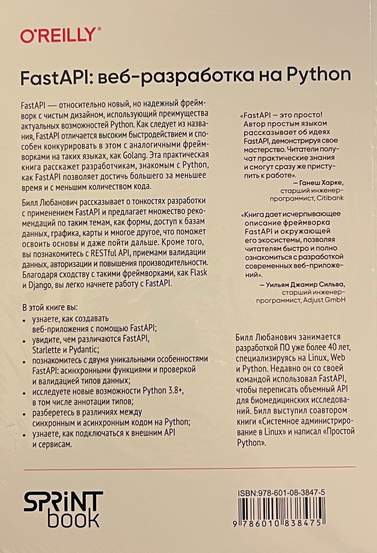 Билл Любанович рассказывает о тонкостях разработки с применением FastAPI и предлагает множество рекомендаций по таким темам, как формы, доступ к базам данных, графика, карты и многое другое, что поможет освоить основы и даже пойти дальше. Кроме того, вы познакомитесь с RESTful API, приемами валидации данных, авторизации и повышения производительности. Благодаря сходству с такими фреймворками, как Flask и Django, вы легко начнете работу с FastAPI.