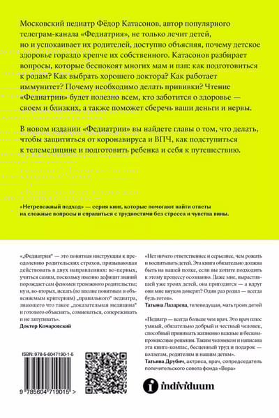 Московский педиатр Фёдор Катасонов, автор популярного телеграм-канала «Федиатрия», не только лечит детей, но и успокаивает их родителей, доступно объясняя, почему детское здоровье гораздо крепче их собственного. Катасонов разбирает вопросы, которые беспокоят многих мам и пап: как подготовиться к родам? Как выбрать хорошего доктора? Как работает иммунитет? Почему необходимо делать прививки? Чтение «Федиатрии» будет полезно всем, кто заботится о здоровье — своем и близких, а также поможет сберечь ваши деньги и нервы.