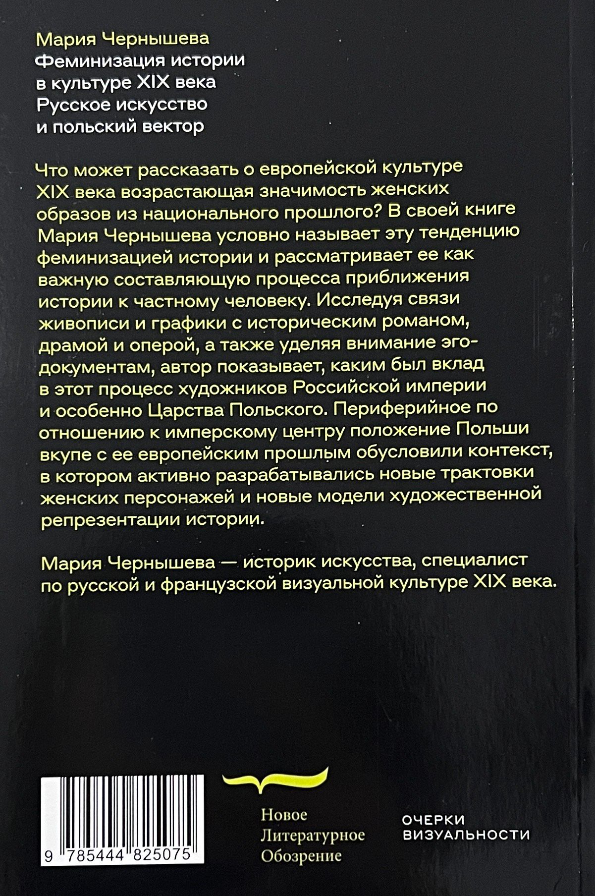 Что может рассказать о европейской культуре XIX века возрастающая значимость женских образов из национального прошлого? В своей книге Мария Чернышева условно называет эту тенденцию феминизацией истории и рассматривает ее как важную составляющую процесса приближения истории к частному человеку. Исследуя связи живописи и графики с историческим романом, драмой и оперой, а также уделяя внимание эго-документам, автор показывает, каким был вклад в этот процесс художников Российской империи и особенно Царства Польского. Периферийное по отношению к имперскому центру положение Польши вкупе с ее европейским прошлым обусловили контекст, в котором активно разрабатывались новые трактовки женских персонажей и новые модели художественной репрезентации истории. Мария Чернышева — историк искусства, специалист по русской и французской визуальной культуре XIX века.