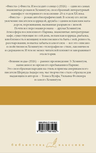 Фиеста («Фиеста. И восходит солнце») (1926) — один из самых знаменитых романов Хемингуэя, своеобразный литературный манифест «потерянного поколения» 20-х годов XX века. «Фиеста» — роман автобиографический. В основу его легли увлечение писателем корридой, дружба с одним испанским матадором, переживания, вызванные разрывом с женой. Почти все персонажи романы — друзья Хемингуэя. Атмосфера послевоенного Парижа, знаменитые литературные кафе, существующие по сей день, испанская коррида, рыбалка, влюбленность в женщину и невозможность быть с ней, ревность, разочарования, попытка забыться алкоголем — все это описано в свойственном Хемингуэю «телеграфном» стиле, лаконичном и сдержанном. И тем не менее читателей пленяет и завораживает эта история. «Вешние воды» (1926) — раннее произведение Э. Хемингуэя, написанное во время его пребывания в Париже. Это своеобразная пародия на стиль и приемы американского писателя Шервуда Андерсона, чье творчество стало образцом для выдающихся авторов — Томаса Вулфа, Уильяма Фолкнера и самого Хемингуэя.