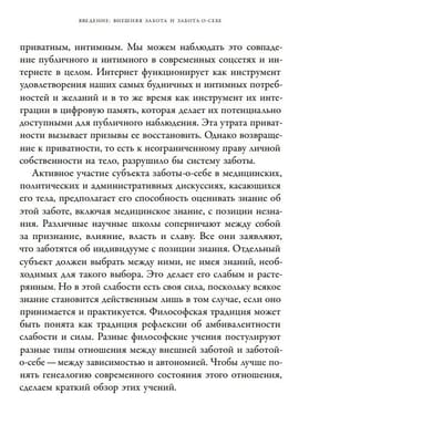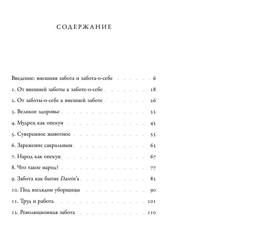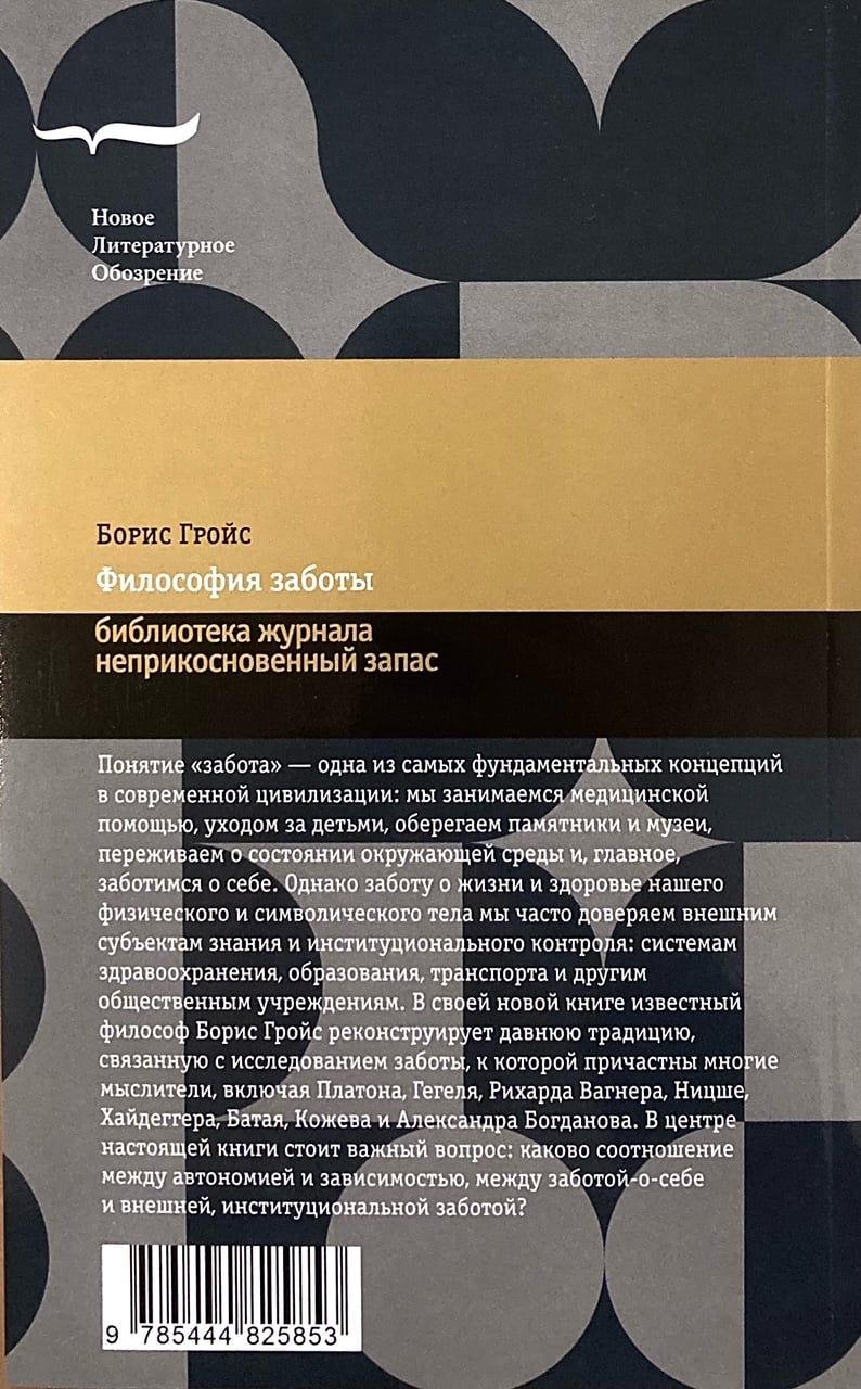 Понятие «заботы» — одна из самых фундаментальных концепций в современной цивилизации: мы занимаемся медицинской помощью, уходом за детьми, оберегаем памятники и музеи, переживаем о состоянии окружающей среды и, главное, заботимся о себе. Однако заботу о жизни и здоровье нашего физического и символического тела мы часто доверяем внешним субъектам знания и институционального контроля: системам здравоохранения, образования, транспорта и другим общественным учреждениям. В своей новой книге известный философ Борис Гройс реконструирует давнюю традицию, связанную с исследованием заботы, к которой причастны многие мыслители, включая Платона, Гегеля, Рихарда Вагнера, Ницше, Хайдеггера, Батая, Кожева и Александра Богданова. В центре настоящей книги стоит важный вопрос: каково соотношение между автономией и зависимостью, между заботой-о-себе и внешней, институциональной заботой?