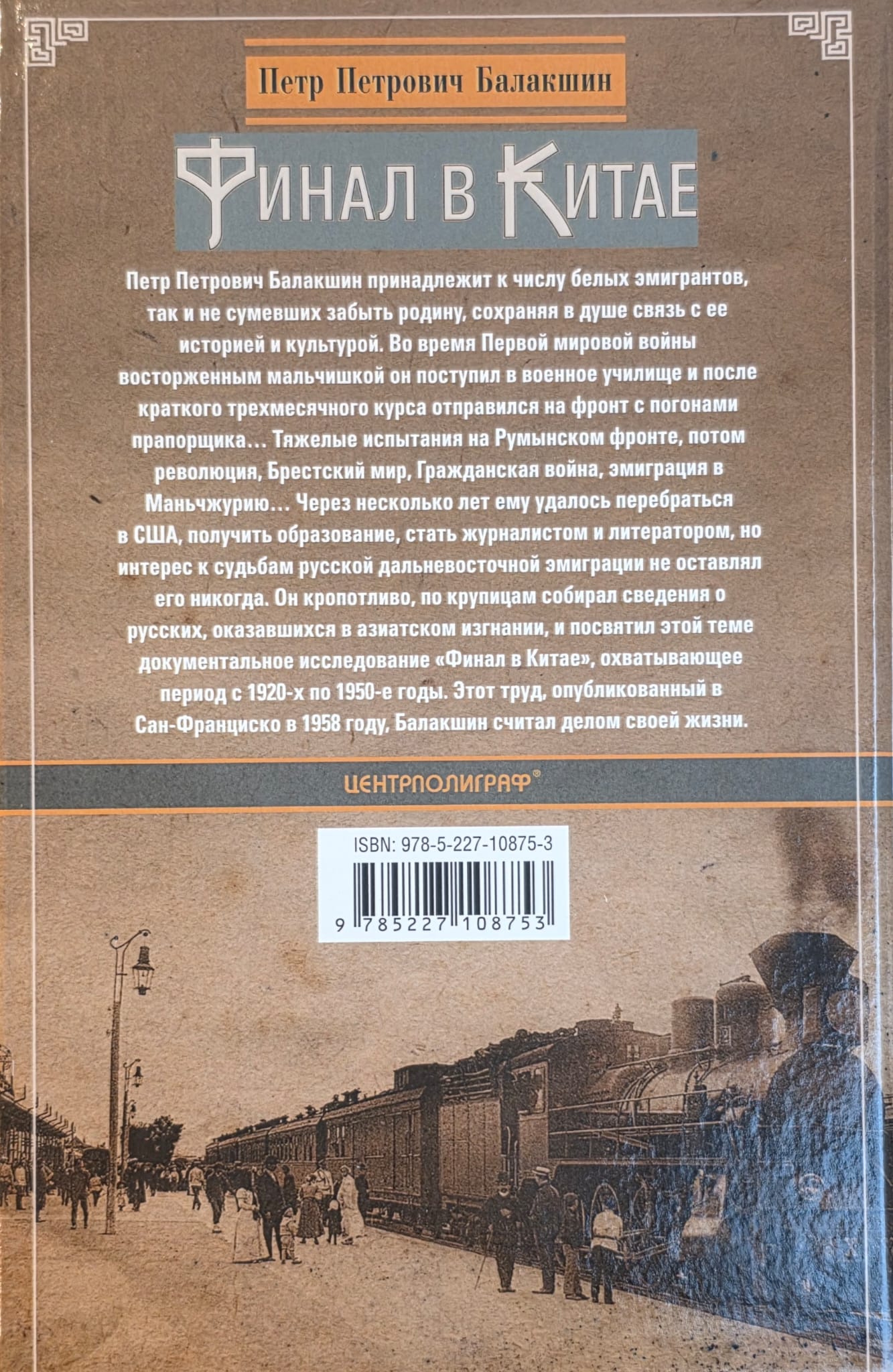 Петр Петрович Балакшин принадлежит к числу белых эмигрантов, так и не сумевших забыть родину, сохраняя в душе связь с ее историей и культурой. Во время Первой мировой войны восторженным мальчишкой он поступил в военное училище и после краткого трехмесячного курса отправился на фронт с погонами прапорщика… Тяжелые испытания на Румынском фронте, потом революция, Брестский мир, Гражданская война, эмиграция в Маньчжурию… Через несколько лет ему удалось перебраться в США, получить образование, стать журналистом и литератором, но интерес к судьбам русской дальневосточной эмиграции не оставлял его никогда. Он кропотливо, по крупицам собирал сведения о русских, оказавшихся в азиатском изгнании, и посвятил этой теме документальное исследование «Финал в Китае», охватывающее период с 1920-х по 1950-е годы. Этот труд, опубликованный в Сан-Франциско в 1958 году, Балакшин считал делом своей жизни.