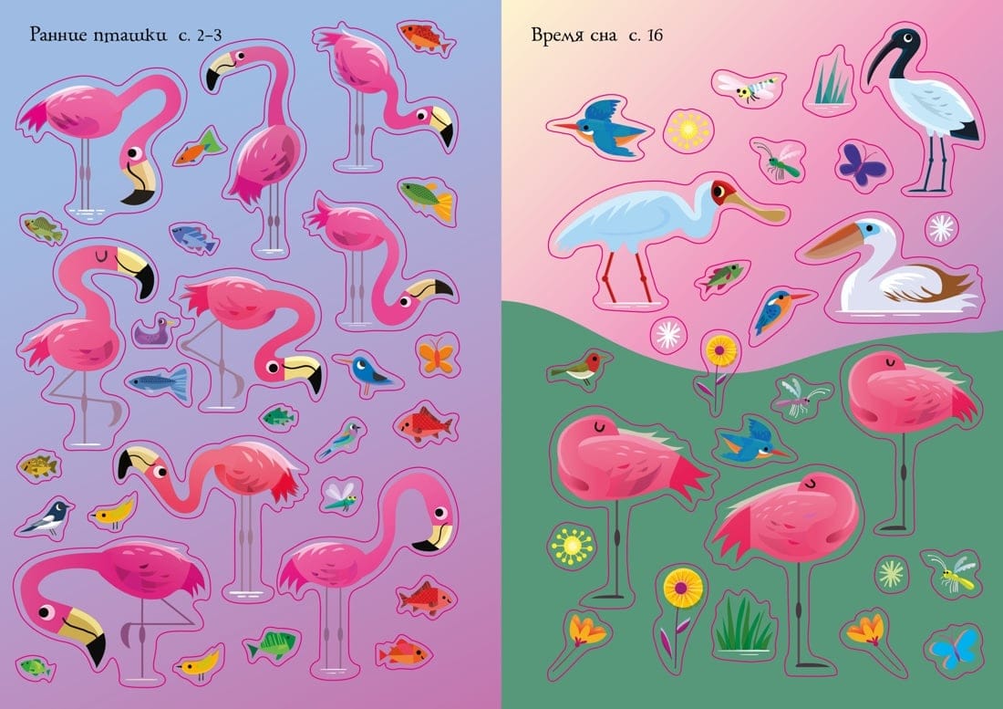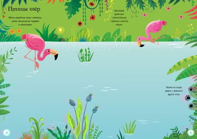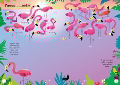 На озере обитают розовые фламинго. Посмотри, как проходит их день, а заодно познакомься с другими птицами, живущими на воде: журавлями, цаплями, шилоклювками и пеликанами.