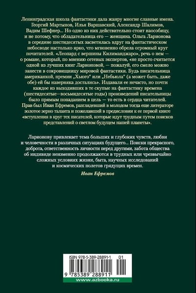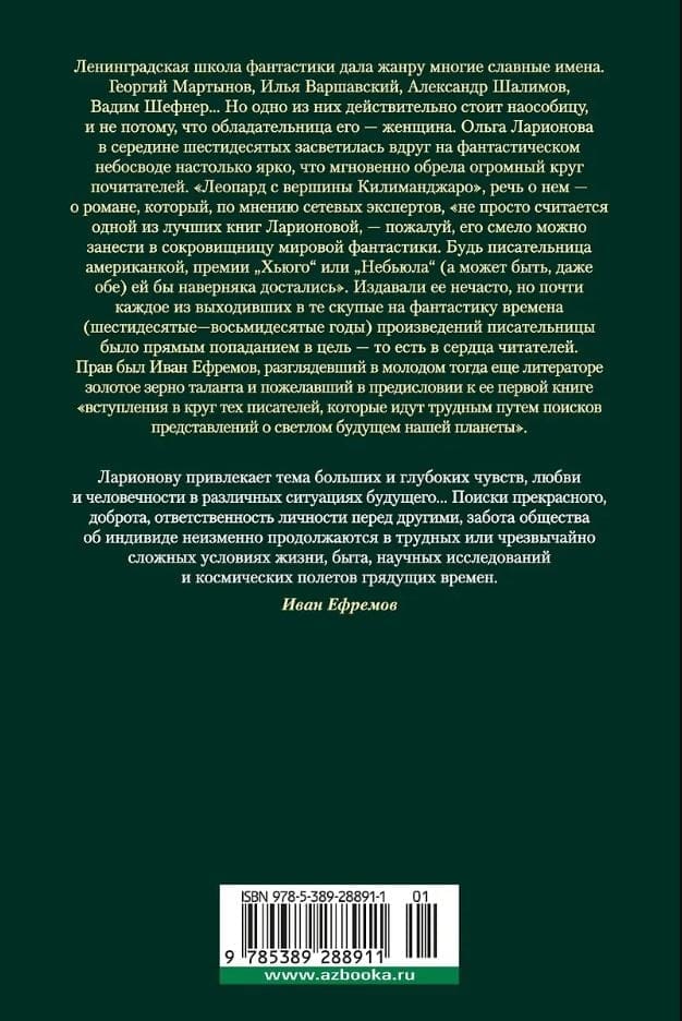 Ольга Ларионова в середине шестидесятых засветилась вдруг на фантастическом небосводе настолько ярко, что мгновенно обрела огромный круг почитателей. «Леопард с вершины Килиманджаро», мы говорим о нем — о романе, который, по мнению сетевых экспертов, «не просто считается одной из лучших книг Ларионовой, — пожалуй, его смело можно занести в сокровищницу мировой фантастики. Будь писательница американкой, премии «Хьюго» или «Небьюла» (а может быть, даже обе) ей бы наверняка достались». Издавали ее нечасто, но почти каждое из выходивших в те скупые на фантастику времена (шестидесятые — восьмидесятые годы) произведений писательницы было прямым попаданием в цель — то есть в сердца читателей.