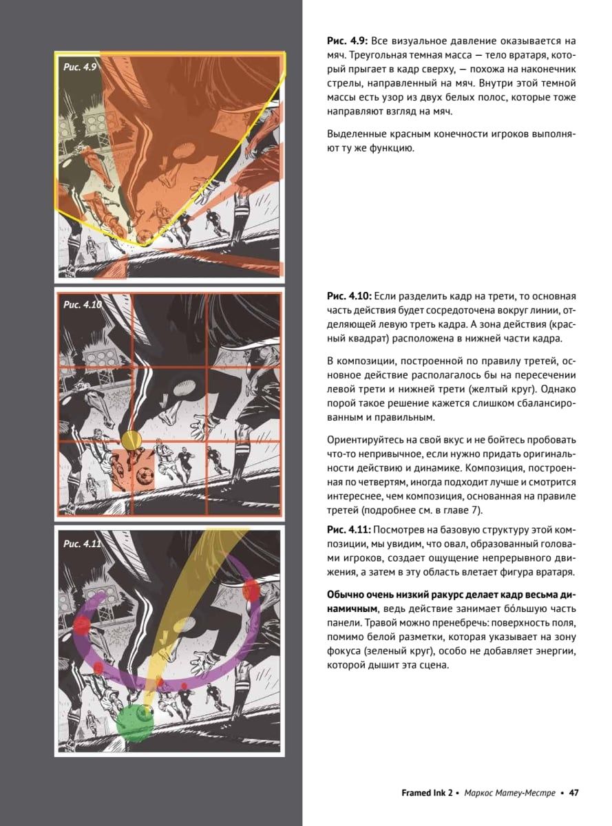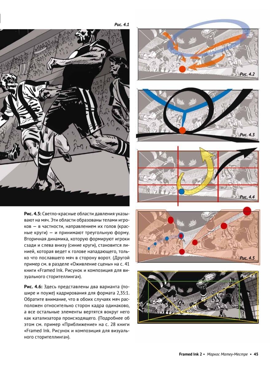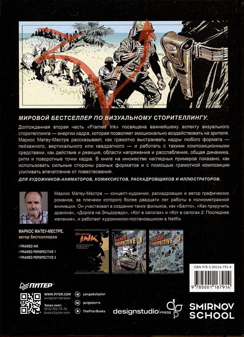 Мировой бестселлер по визуальному сторителлингу. Маркос Матеу-Местре — концепт-художник, раскадровщик и автор графических романов, за плечами которого более двадцати лет работы в полнометражной анимации. Он участвовал в создании таких фильмов, как «Балто», «Как приручить дракона», «Дорога на Эльдорадо», «Кот в сапогах» и «Кот в сапогах 2: Последнее желание», и работает художником-постановщиком в Netflix. Долгожданная вторая часть «Framed Ink» посвящена важнейшему аспекту визуального сторителлинга — энергии кадра, которая позволяет эмоционально воздействовать на зрителя. Маркос Матеу-Местре рассказывает, как грамотно выстраивать кадры любого формата — пейзажного, вертикального или квадратного — и работать с такими композиционными средствами, как действие и реакция, области напряжения и расслабления, общая динамика, ритм и поворотные точки кадра. В книге на множестве наглядных примеров показано, как использовать сильные стороны разных форматов и с помощью грамотной композиции усиливать впечатление от повествования. Для художников-аниматоров, комиксистов, раскадровщиков и иллюстраторов.
