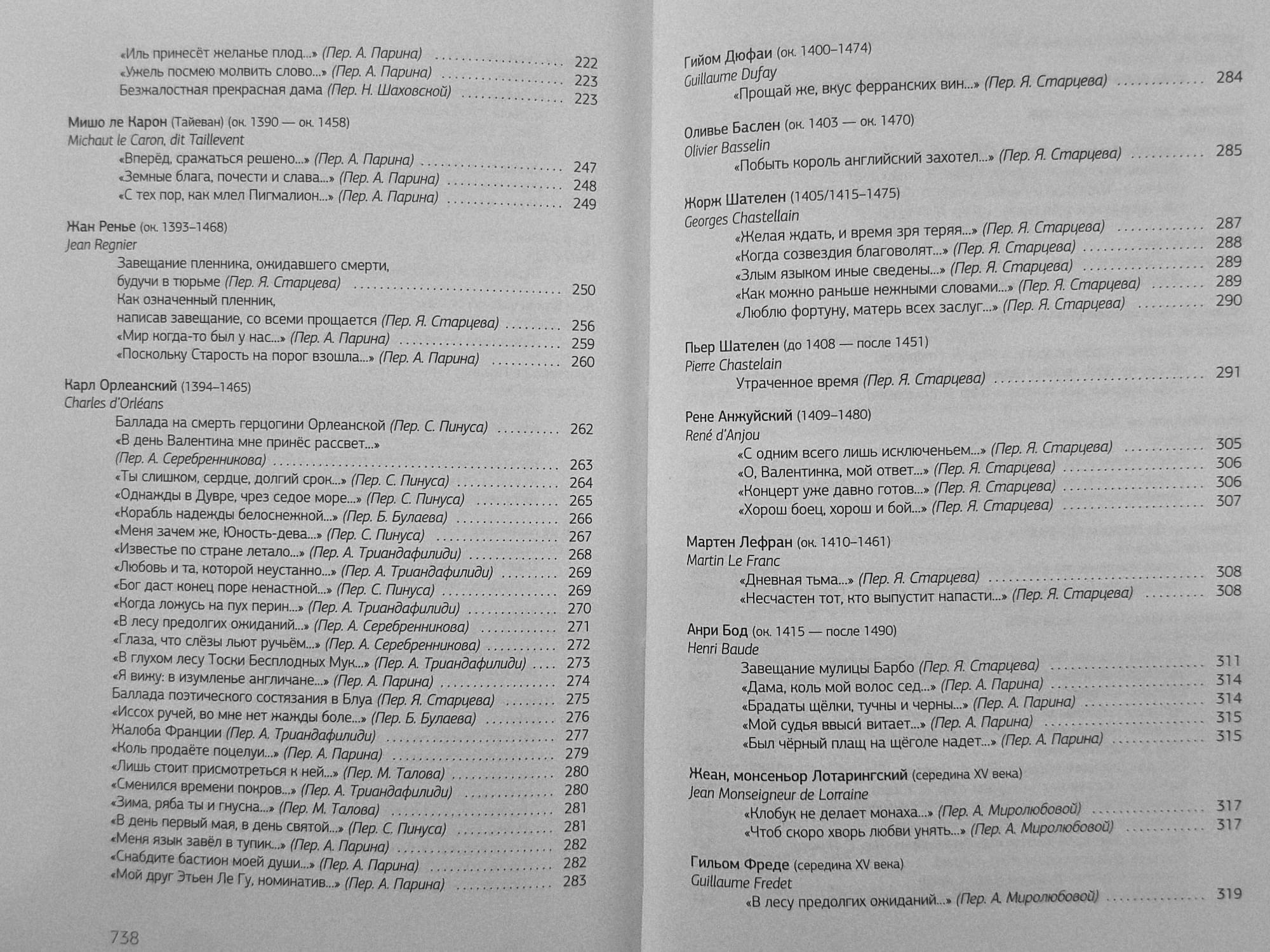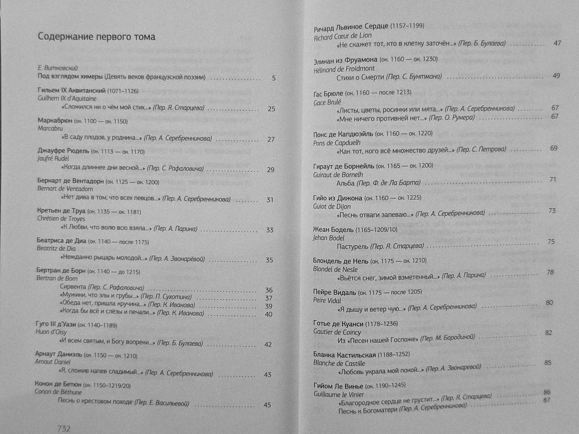 В первый том антологии вошли произведения поэтов с начала XII до начала XVI веков: от ранних трубадуров, в чьём творчестве отразились рыцарские традиции позднего средневековья и впервые сложились многие дожившие до наших дней поэтические формы, до эпохи расцвета куртуазной поэзии. В огромном созвездии здесь предстают великие имена Борна, Эсташа Дешана, Карла Орлеанского, Франсуа Вийона, поэтов Плеяды: Пьера де Ронсара, Жоашена дю Белле и, наконец, гугенота Агриппы д'Обинье. Значительная часть произведений, вошедших в этот том, или переведена впервые, или представляет собой переводы, по разным причинам неизвестные современному читателю.