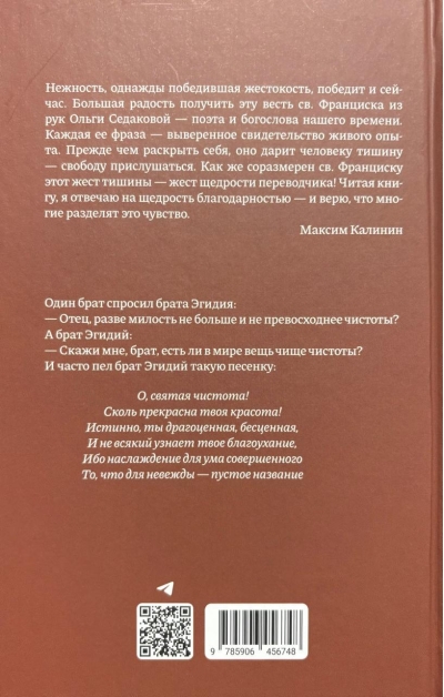 Новая книга переводов и комментариев Ольги Седаковой посвящена Франциску Ассизскому и включает тексты раннефранцисканской литературы XIII-XIV веков, целиком или отдельными главками, а также слова, продиктованные самим святым. Главными героями повествований становятся Франциск и его первые братья, Госпожа Нищета и брат губбийский волк, Христос, дарующий святому Стигматы, и все творение, жители родного Ассизи и всей будущей Италии, прокаженные и Папы. Мягко переводя нас из текста в текст своим уникальным голосом, Ольга Седакова как будто ведет цельную мелодию — о том, как привлекательна может быть одна святая жизнь и какой легкой и желанной она делает сообщительность всего со всем.