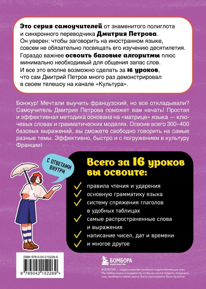 Это серия самоучителей от знаменитого полиглота и синхронного переводчика Дмитрия Петрова. Он уверен: чтобы заговорить на иностранном языке, совсем не обязательно посвящать его изучению десятилетия. Гораздо важнее освоить базовые алгоритмы, плюс — минимально необходимый для общения запас слов.