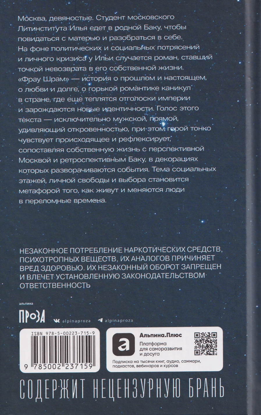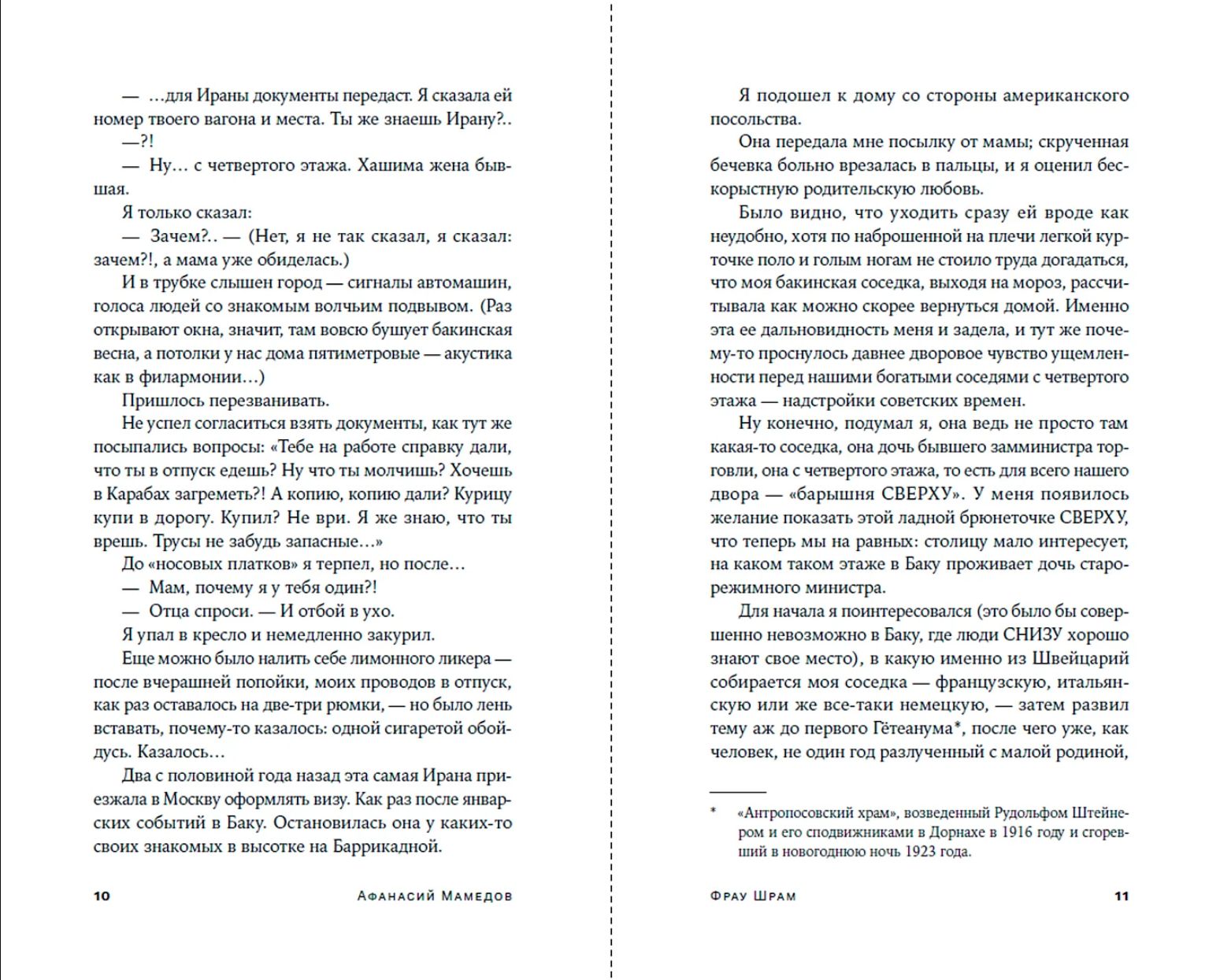 «Фрау Шрам» — история о прошлом и настоящем, о любви и долге, о горькой романтике «каникул» в стране, где еще теплятся отголоски империи и зарождаются новые идентичности. Голос этого текста — исключительно мужской, прямой, удивляющий откровенностью, при этом герой тонко чувствует происходящее и рефлексирует, сопоставляя собственную жизнь с перспективной Москвой и ретроспективным Баку, в декорациях которых разворачиваются события. Тема социальных этажей, личной свободы и выбора становится метафорой того, как живут и меняются люди в переломные времена.