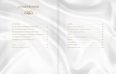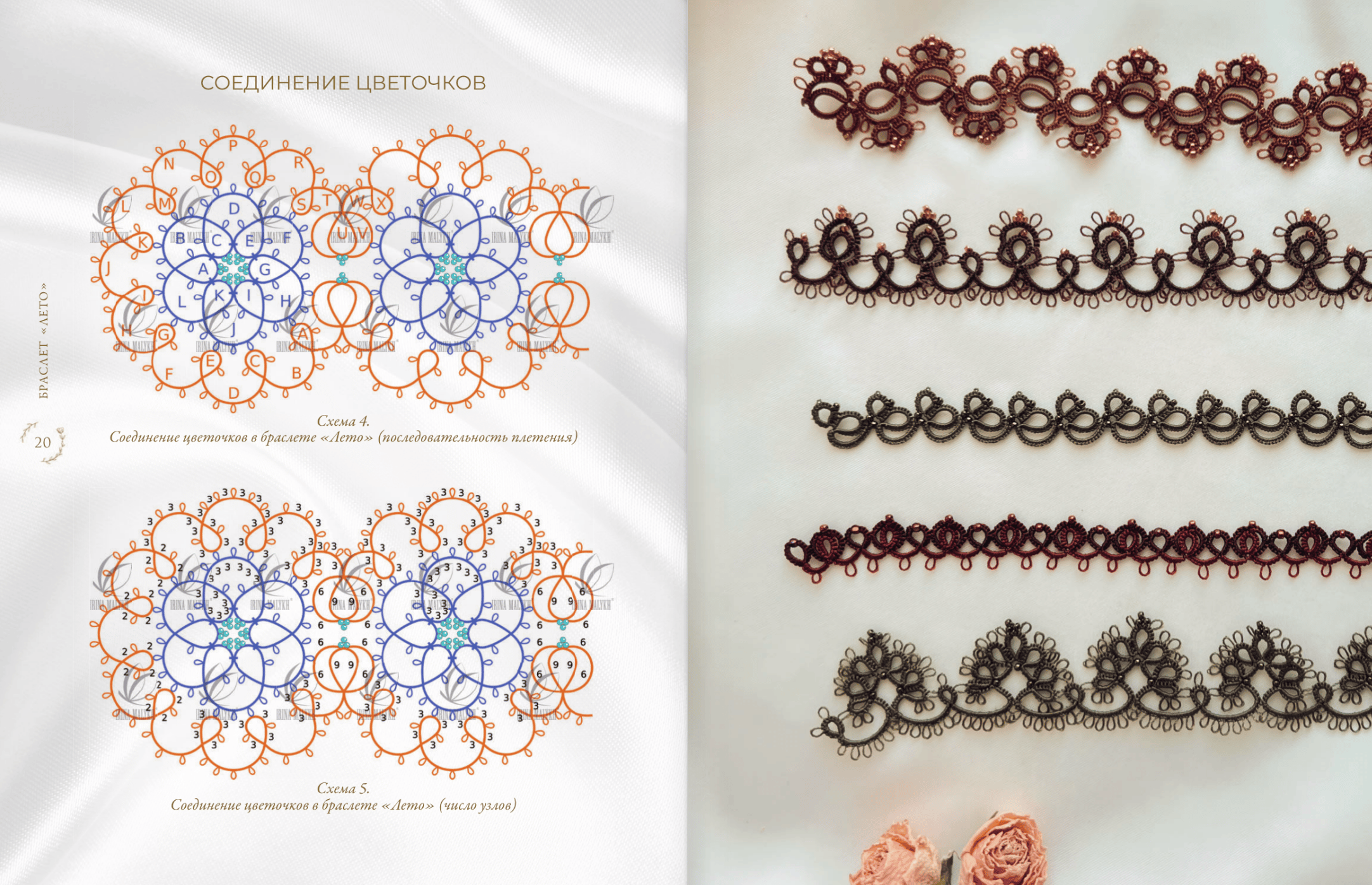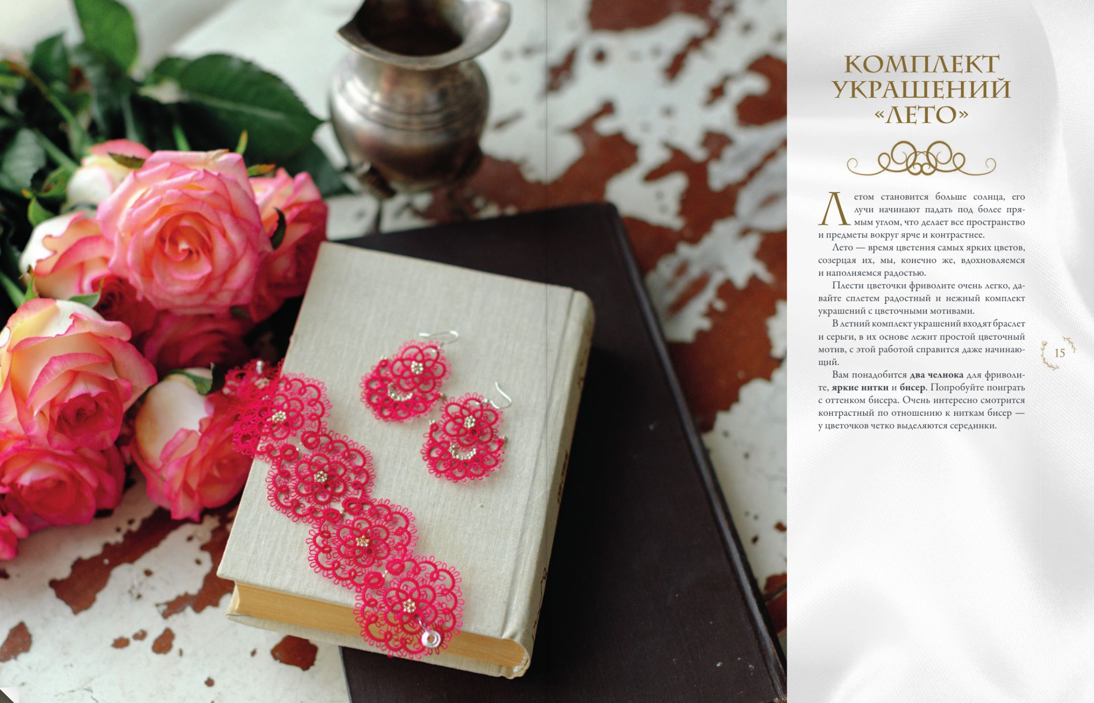- 4 мастер-класса с пошаговыми описаниями и схемами по созданию изумительных украшений: комплект украшений «Лето», салфетка фриволите «Осень», нежные манжеты, колье «Весна»;