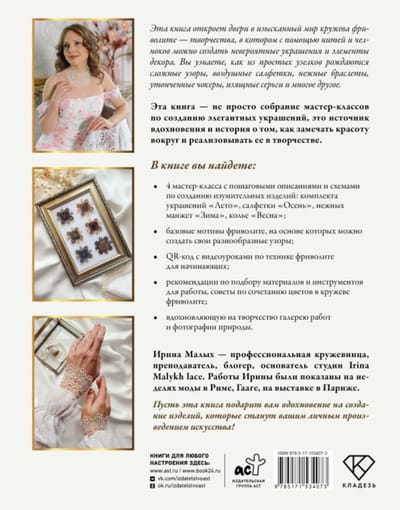 Эта книга — не просто собрание мастер-классов по созданию элегантных украшений, это источник вдохновения и история о том, как замечать красоту вокруг и реализовывать ее в творчестве. Вы узнаете, как с помощью нитей и челноков из простых узелков рождаются сложные узоры, воздушные салфетки, нежные браслеты, утонченные чокеры, изящные серьги и многое другое.