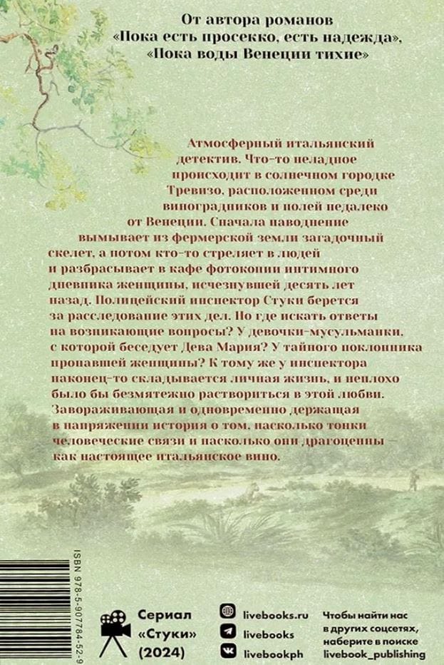 Что-то неладное происходит в солнечном городке Тревизо, расположенном среди виноградников и полей недалеко от Венеции. Сначала наводнение вымывает из фермерской земли загадочный скелет, а потом кто-то стреляет в людей и разбрасывает в кафе фотокопии интимного дневника женщины, исчезнувшей десять лет назад. Полицейский инспектор Стуки берётся за расследование этих дел. Но где искать ответы на возникающие вопросы? У девочки-мусульманки, с которой беседует Дева Мария? У тайного поклонника пропавшей женщины? К тому же у инспектора наконец-то складывается личная жизнь, и неплохо было бы безмятежно раствориться в этой любви. Завораживающая и одновременно держащая в напряжении история о том, насколько тонки человеческие связи и насколько они драгоценны — как настоящее итальянское вино.