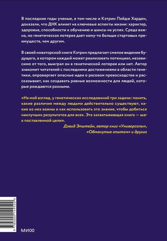 Именно это и доказывает в своей книге психогенетик Кэтрин Пейдж Харден: различия в ДНК реально влияют на жизненные шансы — и игнорировать этот факт опаснее, чем говорить о нем открыто. С опорой на современные исследования она раскрывает, что на самом деле означает «генетическая лотерея», почему одни дети учатся легче, а другим нужна поддержка, что такое полигенные индексы и как они работают, почему генетика никак не объясняет «расовых различий» и как генетика может помочь создать справедливые системы образования, медицины и социальной политики.
