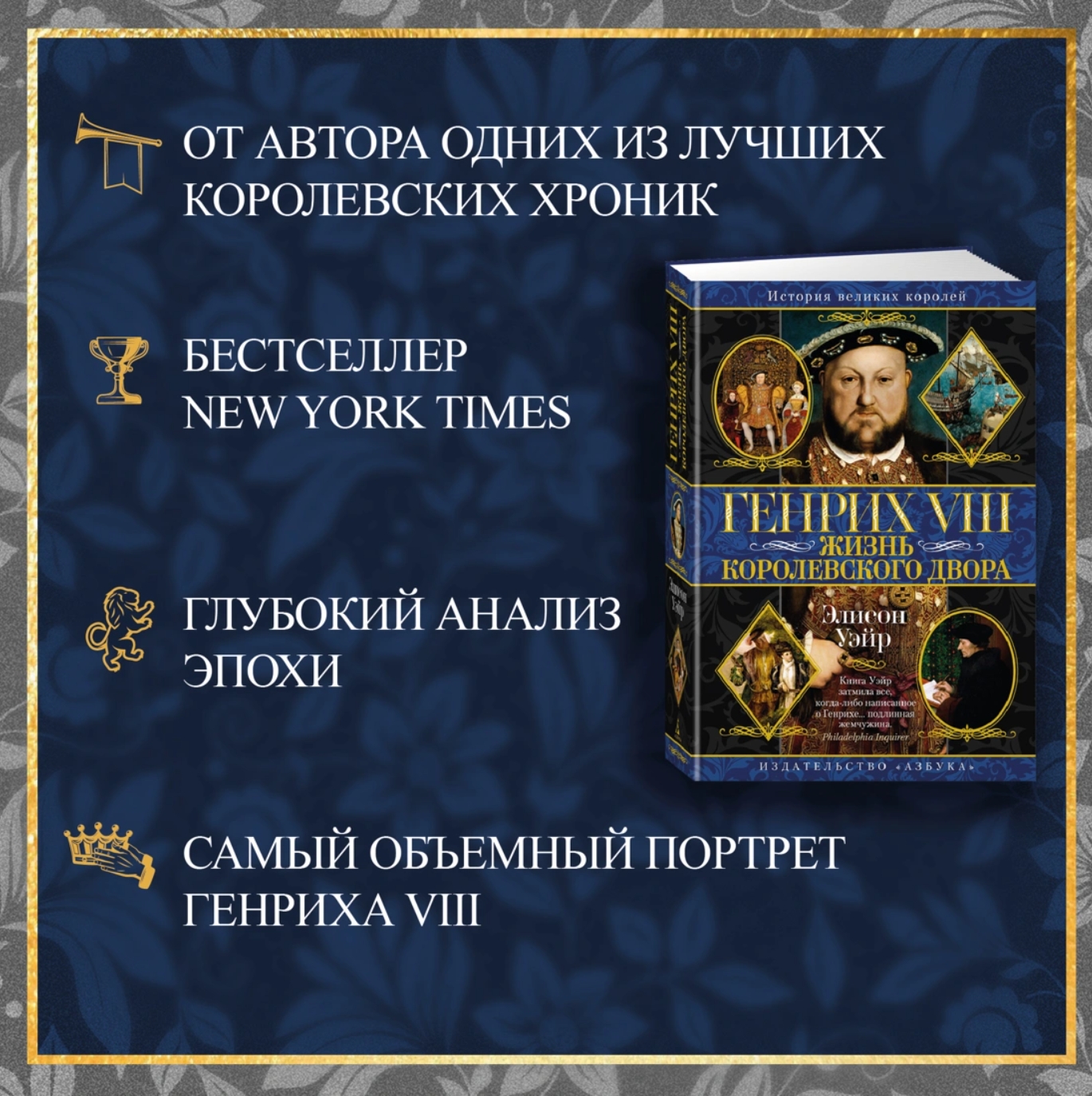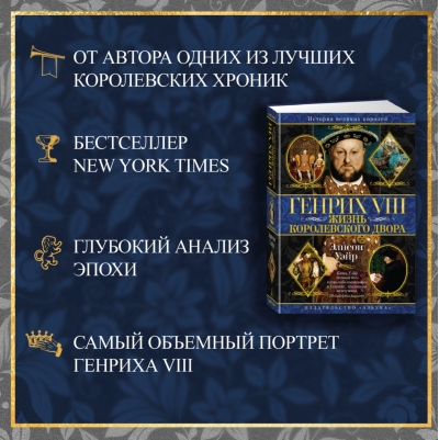 Английскому королю Генриху VIII суждено было стать одним из тех монархов, чье имя и спустя несколько столетий известно всему миру. Его внешний облик запечатлели портреты работы великих живописцев эпохи Возрождения, характерные черты его личности, восхищавшей, интриговавшей и устрашавшей современников, в изобилии проступают в самых разнообразных свидетельствах на страницах исторических документов. Как и подробности его биографии: с течением веков она стала поистине легендарной, и в наши дни побуждает ученых, писателей, режиссеров вновь и вновь обращаться к жизни королевского двора в ту далекую эпоху. В своем исследовании Элисон Уэйр — профессиональный историк, писатель и признанный мастер жанра королевской хроники — создает объемный и завораживающе человечный портрет Генриха VIII Тюдора, равно далекий и от сухих описаний со страниц учебника, и от бытующего в популярной культуре образа короля, проводящего жизнь в грубых развлечениях и бездумной погоне за удовольствиями. Автор показывает нам иного Генриха — могущественного короля, правившего в эпоху, когда внутренняя и политическая жизнь монарха были неразрывно переплетены — и блестящий, сложно устроенный двор, который он создал сам и жизнью которого управлял. Борьба за власть, войны, интриги, победы и поражения — жизнь Генриха VIII была насыщена событиями; на этом фоне, в окружении придворных, соперничающих за честь и награду попасть в ближний круг короля, перед читателем предстает поистине величественная фигура Генриха VIII.