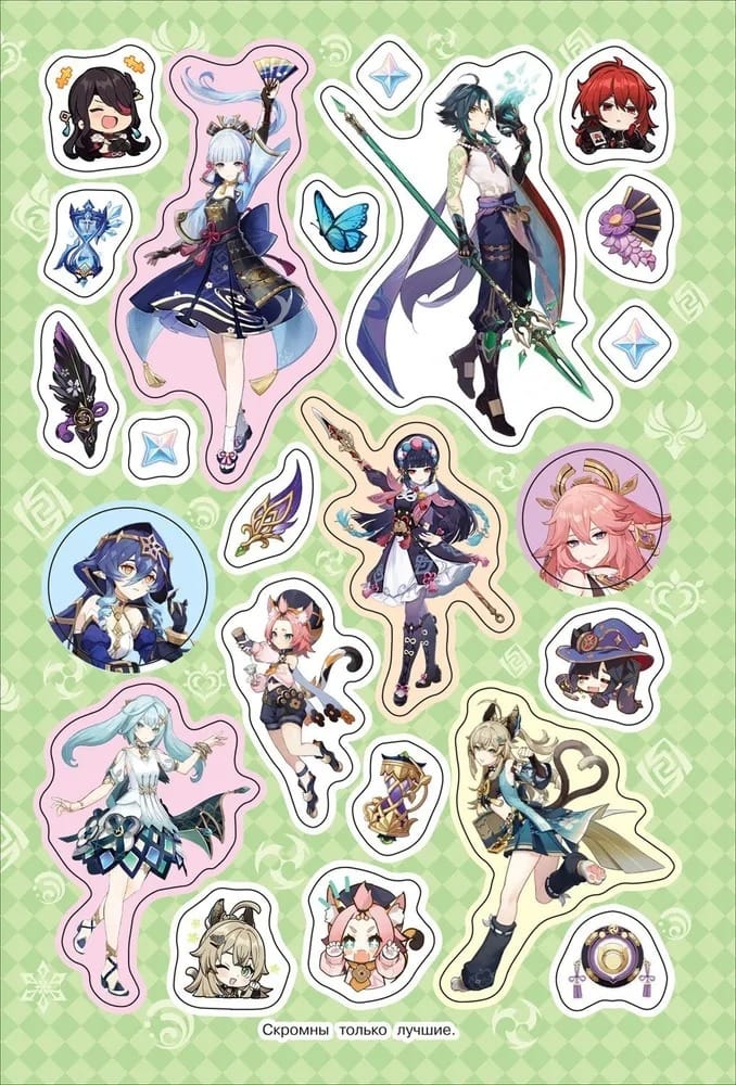 Супермного героев популярной игры Genshin Impact в одном наборе. Здесь собраны и полюбившиеся персонажи (Венти, Аль-Хайтам, Тарталья и другие), и совсем новые (Лини и Линетт). Наклейками можно украсить ежедневник, тетради, скетчбук, телефон и многое другое.