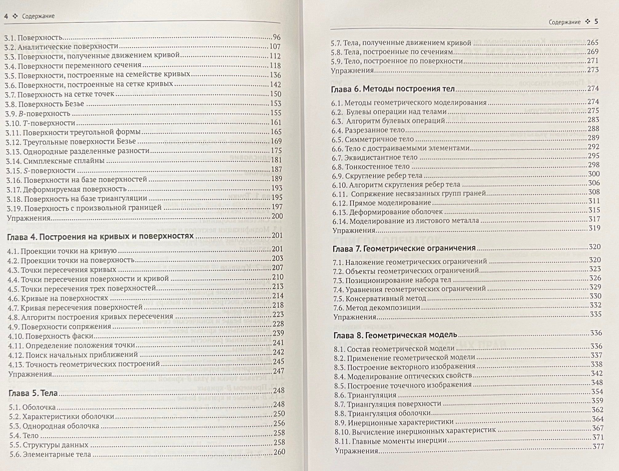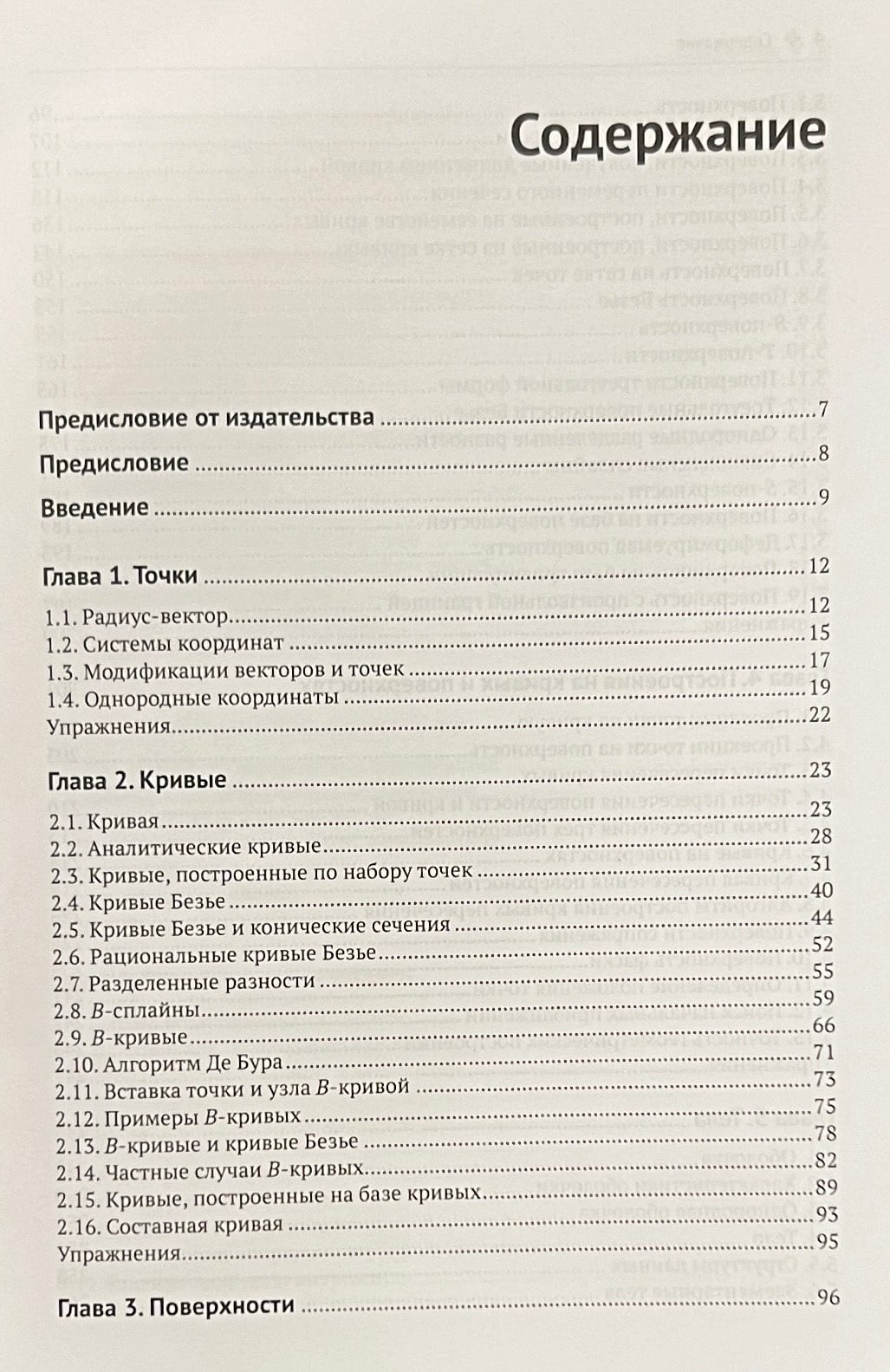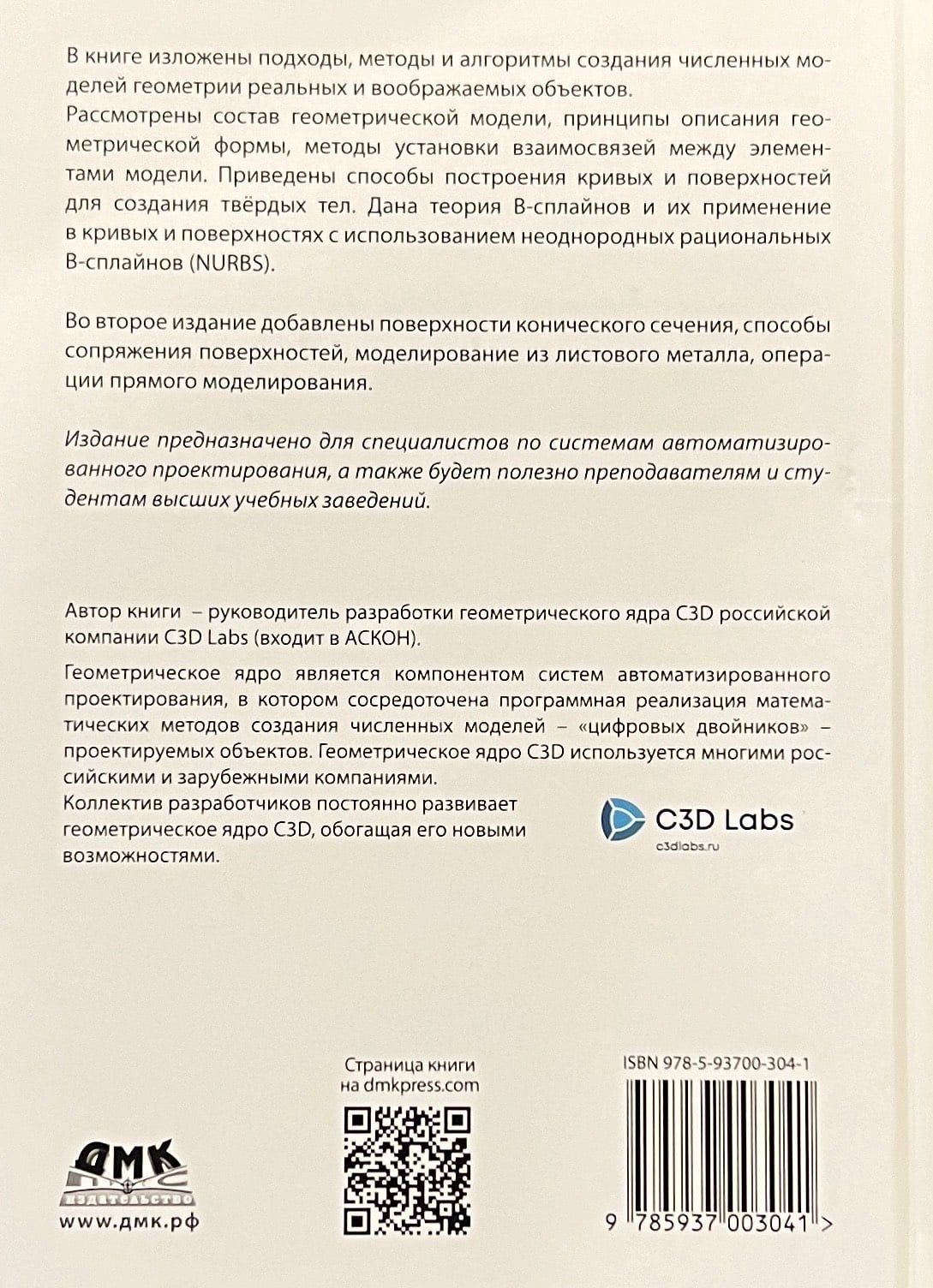 В книге изложены подходы, методы и алгоритмы создания численных моделей геометрии реальных и воображаемых объектов. Рассмотрены состав геометрической модели, принципы описания геометрической формы, методы установки взаимосвязей между элементами модели. Приведены способы построения кривых и поверхностей для создания твёрдых тел. Дана теория B-сплайнов и их применение в кривых и поверхностях с использованием неоднородных рациональных B-сплайнов (NURBS).
