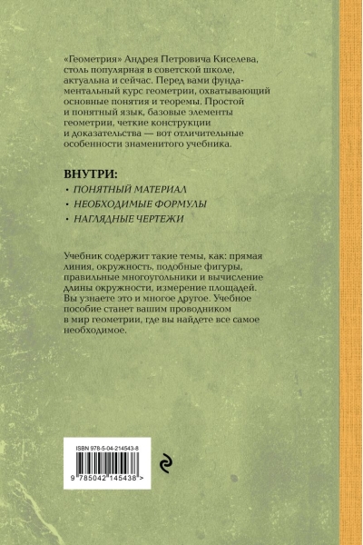 «Геометрия» Андрея Петровича Киселёва, так популярная в советской школе, актуальна и сейчас. Перед вами фундаментальный курс геометрии, охватывающий основные понятия и теоремы. Простой и понятный язык, базовые элементы геометрии, четкие конструкции и доказательства — вот отличительные особенности знаменитого учебника.