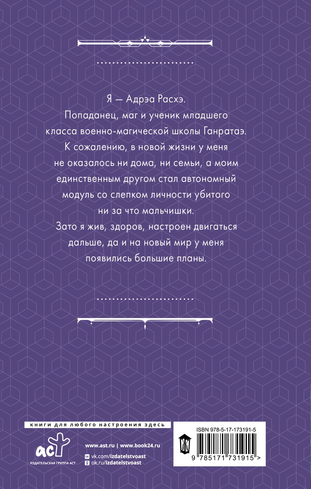 Я — Адрэа Расхэ. Попаданец, маг и ученик младшего класса военно-магической школы Ганратаэ. К сожалению, в новой жизни у меня не оказалось ни дома, ни семьи, а моим единственным другом стал автономный модуль со слепком личности убитого ни за что мальчишки. Зато я жив, здоров, настроен двигаться дальше, да и на новый мир у меня появились большие планы.