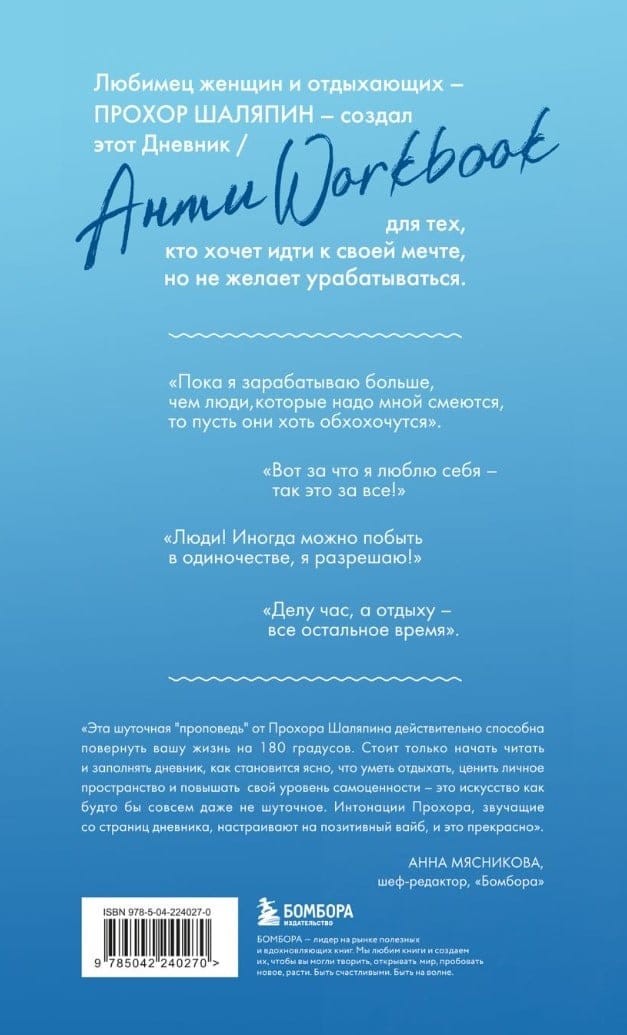 Креативный формат книги, морская «отдыхательная» суперобложка, оригинальное оформление страниц и неповторимое чувство юмора Прохора Шаляпина делают проект желанной покупкой для всех поклонников артиста.