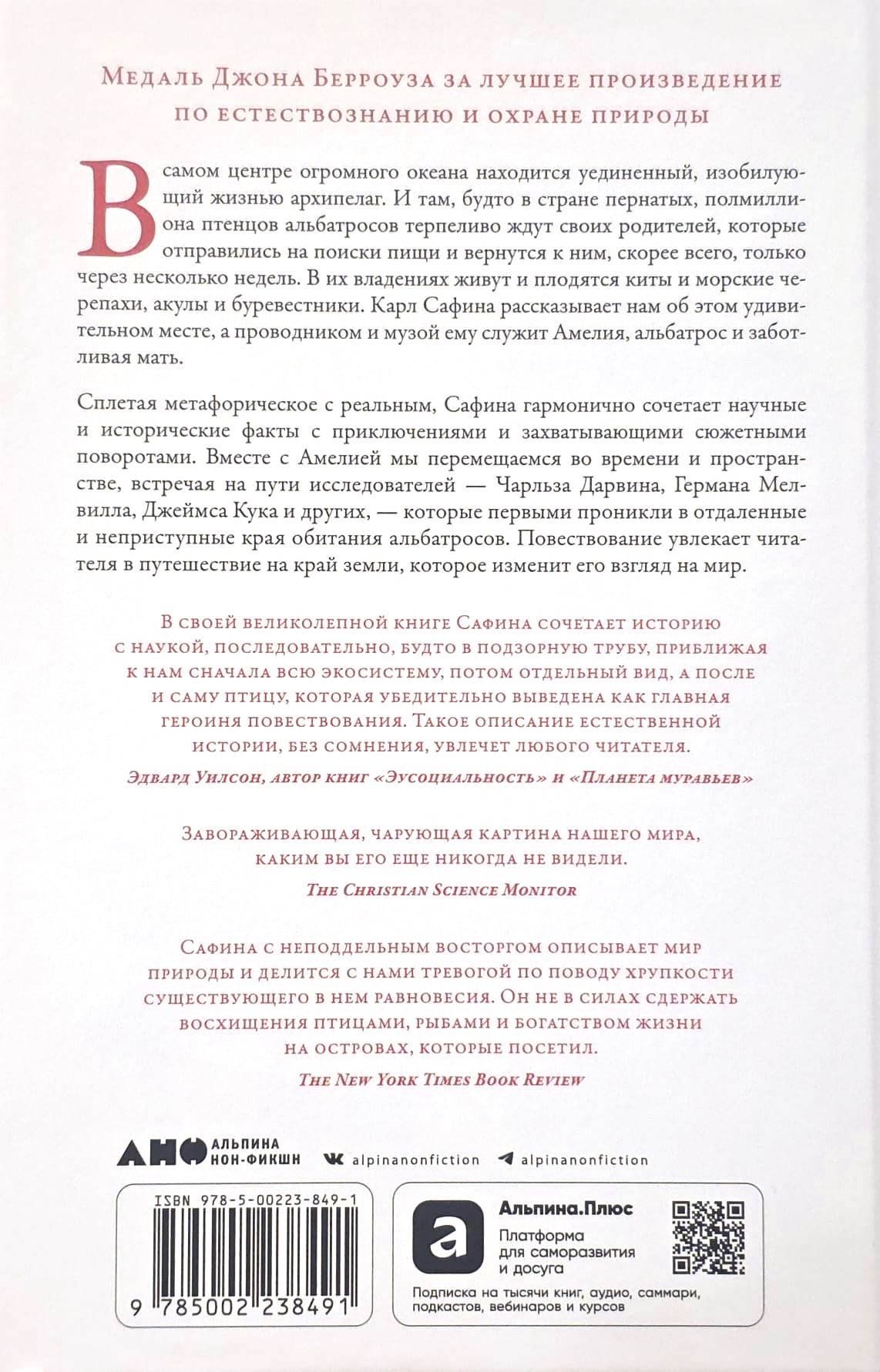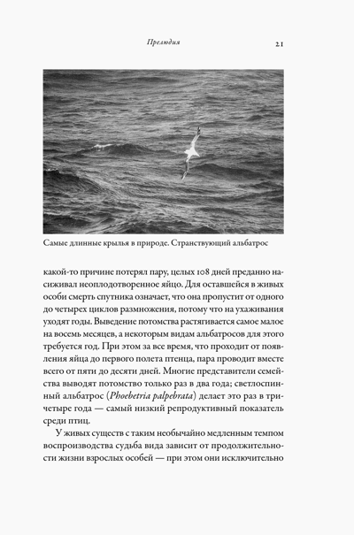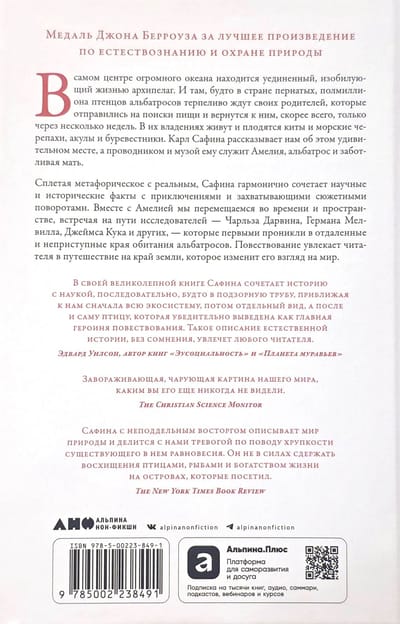 На наших глазах разворачивается драматичная и поэтическая история борьбы и надежды, исключительной выносливости и жизненной стойкости. Стремясь узнать больше об альбатросах, попутно автор знакомится со многими представителями дикой природы, обитающими в океане. Сафине удается не просто увидеть мир, в котором они живут, но и взглянуть на него их глазами. Вместе с Амелией мы путешествуем в пространстве и времени, проникая в отдаленные и неприступные края обитания альбатросов.