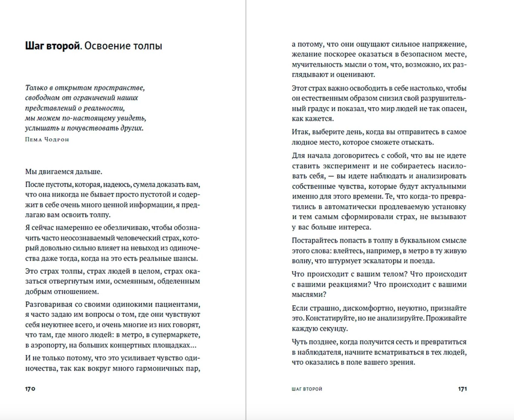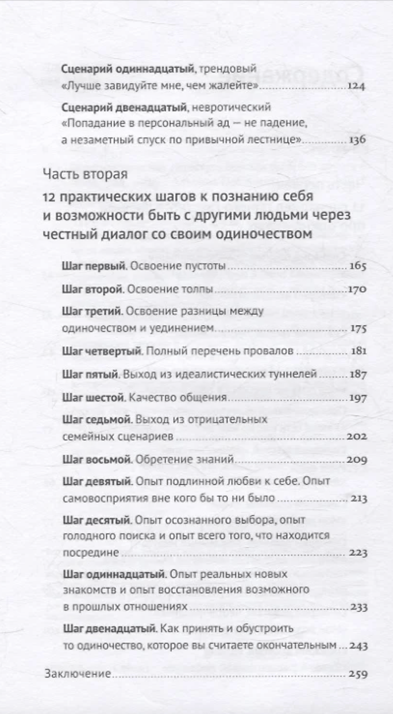 Вторая часть — это последовательность из 12 практик-шагов, которые помогают честно взглянуть в глаза собственному одиночеству — и себе самому. Не давая готовых рецептов, автор книги побуждает читателя исследовать собственное уникальное одиночество и обживать его, обретая внутреннюю свободу и психологическую готовность выстраивать здоровые отношения.