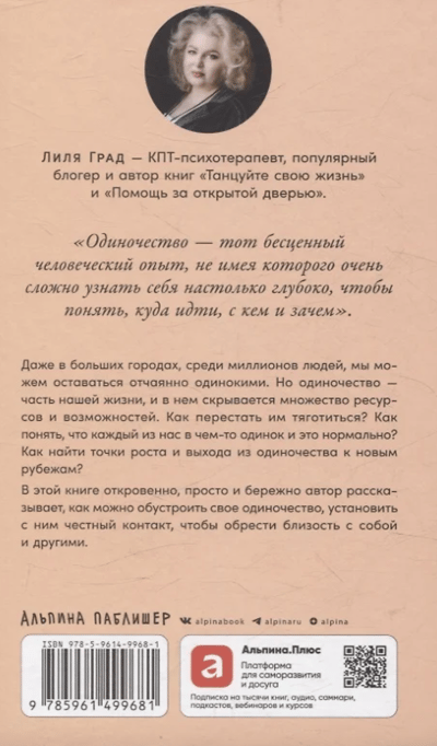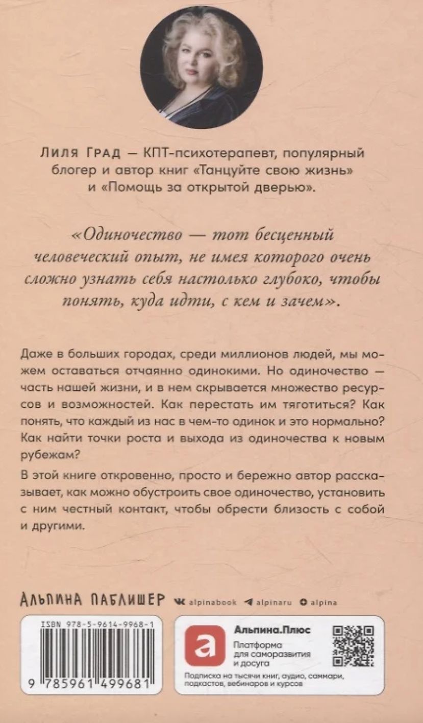 Одиночество — неизменная и неотменимая часть каждой жизни. КПТ-психотерапевт Лиля Град без наукообразия, просто, прямо, образно и очень искренне говорит об этой данности, которая многих страшит, но на деле скрывает в себе множество ресурсов и возможностей. Не научившись быть одиноким, то есть выдерживать себя самого, невозможно выстроить честные отношения и с другими людьми — уверена автор.