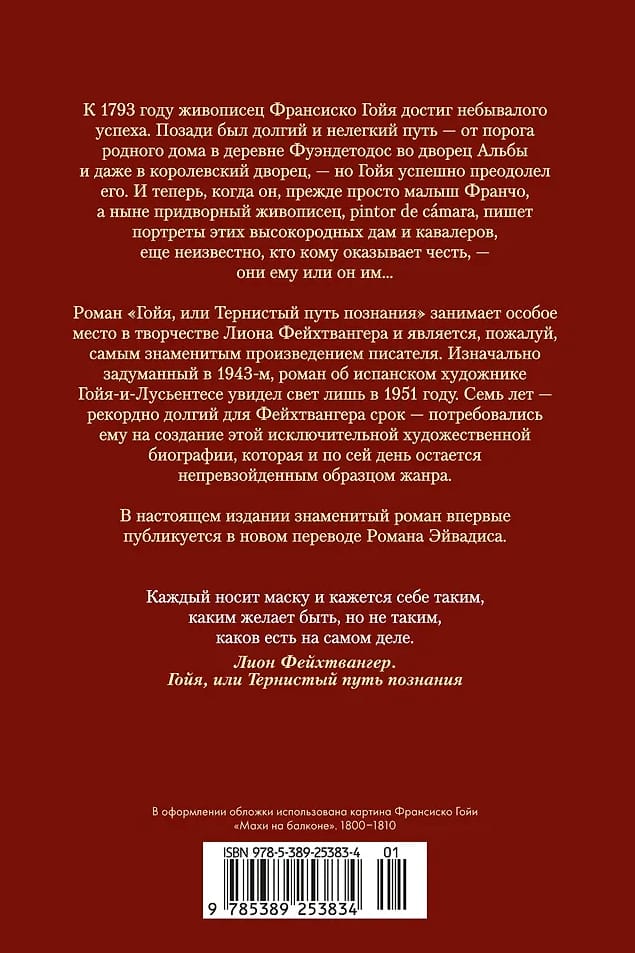 Роман «Гойя, или Тернистый путь познания» занимает особое место в творчестве Лиона Фейхтвангера и является, пожалуй, самым знаменитым произведением писателя. Изначально задуманный в 1943-м, роман об испанском художнике Гойя-и-Лусьентесе увидел свет лишь в 1951 году. Семь лет — рекордно долгий для Фейхтвангера срок — потребовались ему на создание этой исключительной художественной биографии, которая и по сей день остается непревзойденным образцом жанра.