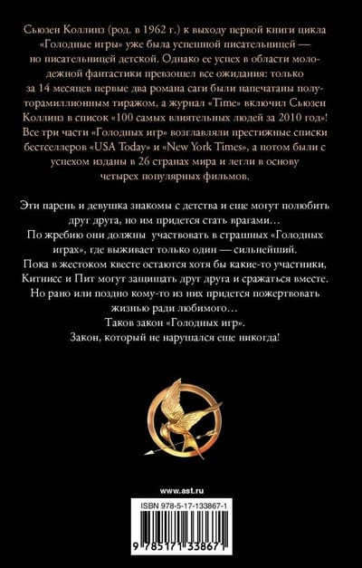 Эти парень и девушка знакомы с детства и еще могут полюбить друг друга, но им придется стать врагами… По жребию они должны участвовать в страшных «Голодных играх», где выживает только один — сильнейший. Пока в жестоком квесте остаются хотя бы какие-то участники, Китнисс и Пит могут защищать друг друга и сражаться вместе. Но рано или поздно кому-то из них придется пожертвовать жизнью ради любимого… Таков закон «Голодных игр». Закон, который не нарушался еще никогда!