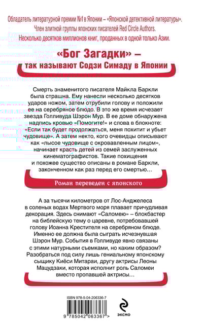 А за тысячи километров от Лос-Анджелеса, в соленых водах Мертвого моря, плавает причудливая декорация. Здесь снимают «Саломею» — блокбастер на библейскую тему о царевне, потребовавшей голову Иоанна Крестителя на серебряном блюде. Именно ее должна была сыграть исчезнувшая Шэрон Мур. События в Голливуде явно связаны с этими натурными съемками, но каким образом? Разобраться под силу лишь гениальному японскому сыщику Киёси Митараи, другу актрисы Леоны Мацудзаки, которая исполнит роль Саломеи вместо пропавшей актрисы…