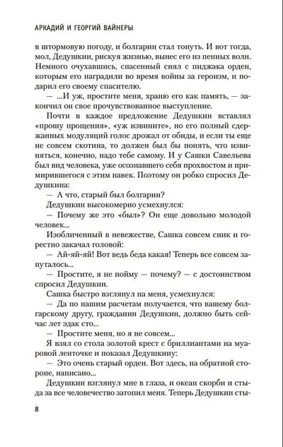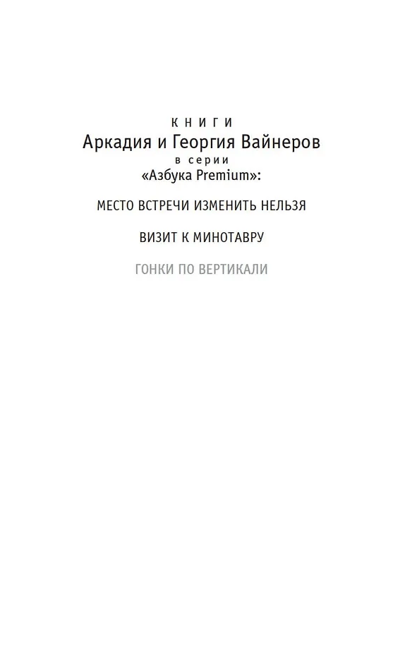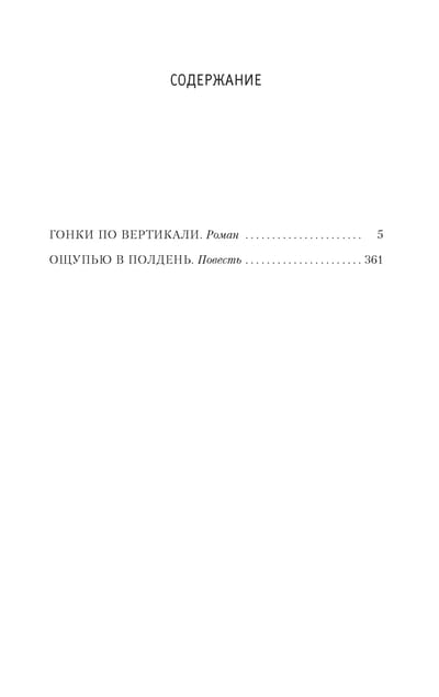«Гонки по вертикали» (1974) — одно из самых известных произведений братьев Вайнеров. И в то же время — почти неизвестное: будучи экранизирован, роман оказался отчасти заслонен одноименным фильмом (1982), в котором сыграли такие популярные актеры, как Андрей Мягков и Валентин Гафт. В фильме сохранилась главным образом внешняя фабула: история противостояния следователя Стаса Тихонова и вора Лехи Дедушкина по кличке Батон. Борьба справедливости с беззаконием, трудолюбия с тунеядством, добра со злом... За этой прямолинейной формулой в книге живут два далеко не схематичных героя-антагониста со своими сомнениями, отчаянием, одиночеством. Благодаря диалогическому построению повествования авторы дают слово в равной мере обеим сторонам. Особенно интересен образ Батона — умного, обаятельного, терзающегося «паразита и отщепенца». Встретятся читатели и со знаменитым героем из «Места встречи изменить нельзя» — Шараповым, ставшим теперь подполковником МУРа. В издание также вошла повесть «Ощупью в полдень» (1968). Именно после ее публикации к Вайнерам пришло широкое признание. Ю. Нагибин назвал повесть «свежим словом в развитии детективного жанра».