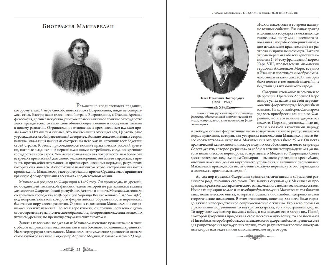 Философ и мыслитель Никколо Макиавелли, без которого невозможно представить себе Италию эпохи Возрождения, оставил после себя, быть может, не такой яркий след, как его деятельные, энергичные современники — представители кланов Борджиа и Медичи. Выходец из семьи небогатого адвоката, будущий автор «Государя» никогда не переставал учиться, сам дал себе образование университетского уровня, а в эпоху военных переворотов, хрупких союзов и искусных интриг оставался человеком книжным, строил карьеру чиновника и вел жизнь преимущественно канцелярскую. Его влияние на культуру и философию Ренессанса, а через них и на всю политическую историю, было более глубинным. Позиция наблюдателя при сильных мира сего давала ему неиссякаемую пищу для размышлений, которые Макиавелли с присущими ему лаконичностью и точностью изложил в письменных трудах. Меткость его исторических оценок снискала ему славу едва ли не официального хроникера своей взрывной эпохи, которая не перестает будоражить умы, а тонкое политическое чутье, глубокое знание военного дела и искусства управления государством подарили миру в его лице одну из ключевых фигур политической науки.