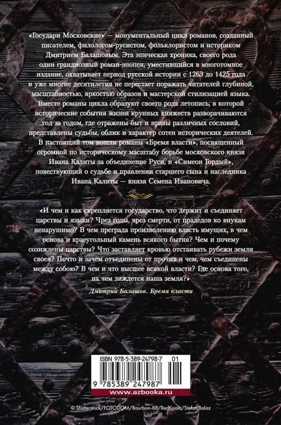«Государи Московские» — монументальный цикл романов, созданный писателем, филологом-русистом, фольклористом и историком Дмитрием Балашовым. Эта эпическая хроника, своего рода один грандиозный роман-эпопея, уместившийся в многотомное издание, охватывает период русской истории с 1263 до 1425 года и уже многие десятилетия не перестает поражать читателей глубиной, масштабностью, яркостью образов и мастерской стилизацией языка. Вместе романы цикла образуют своего рода летопись, в которой исторические события жизни крупных княжеств разворачиваются год за годом, где отражены быт и нравы различных сословий, представлены судьбы, облик и характер сотен исторических деятелей. В настоящий том вошли романы «Бремя власти», посвященный огромной по историческому масштабу борьбе московского князя Ивана Калиты за объединение Руси, и «Симеон Гордый», повествующий о судьбе и правлении старшего сына и наследника Ивана Калиты — князя Семена Ивановича.