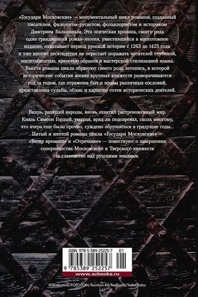 «Государи Московские» — монументальный цикл романов, созданный писателем, филологом-русистом, фольклористом и историком Дмитрием Балашовым. Эта эпическая хроника, своего рода один грандиозный роман-эпопея, уместившийся в многотомное издание, охватывает период русской истории с 1263 до 1425 года и уже многие десятилетия не перестает поражать читателей глубиной, масштабностью, яркостью образов и мастерской стилизацией языка. Вместе романы цикла образуют своего рода летопись, в которой исторические события жизни крупных княжеств разворачиваются год за годом, где отражены быт и нравы различных сословий, представлены судьбы, облик и характер сотен исторических деятелей. Вихрь, разящий народы, вновь охватил растревоженный мир. Князь Симеон Гордый, умирая, вряд ли подозревал, сколь многому, что вчера еще было прочно, суждено обрушиться в грядущие годы… Пятый и шестой романы цикла «Государи Московские» — «Ветер времени» и «Отречение» — повествуют о завершении соперничества Московского и Тверского княжеств за главенство над русскими землями.
