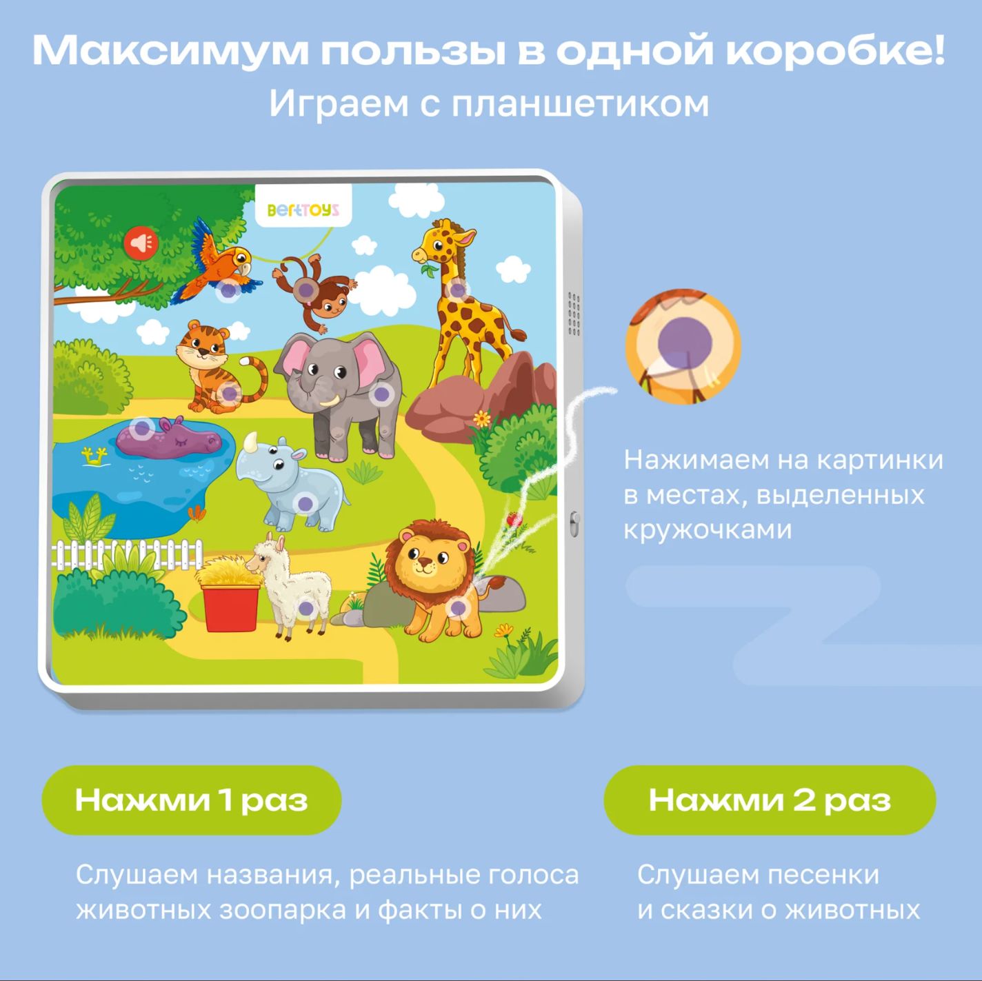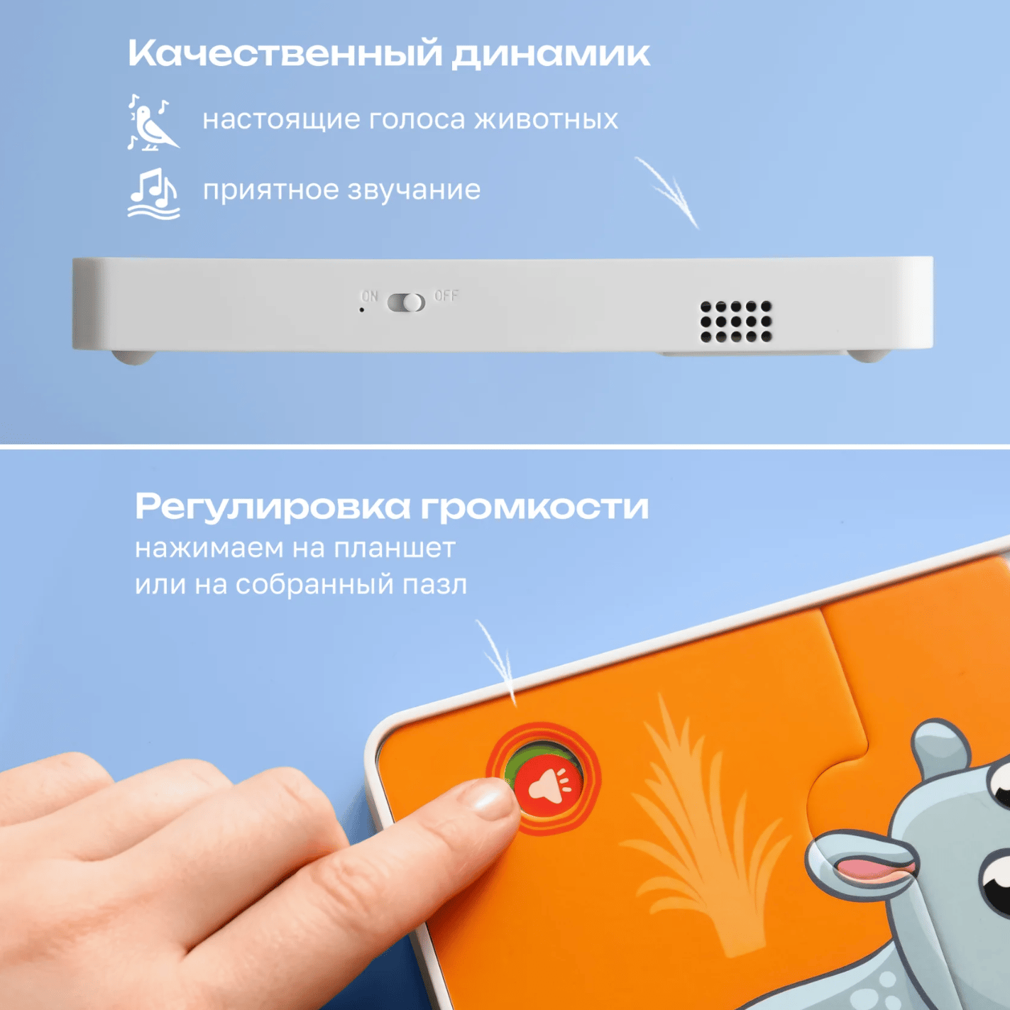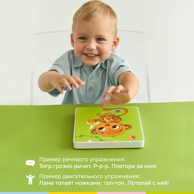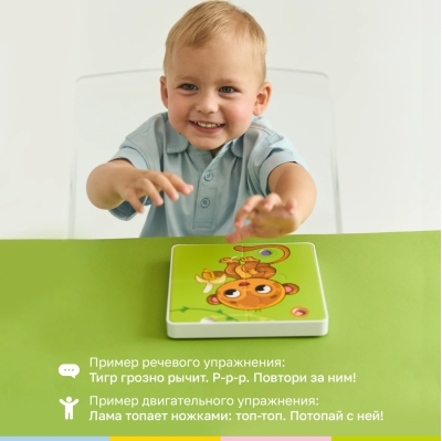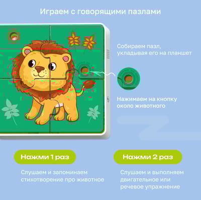 Интерактивный планшет распознает все картинки на пазлах. Два режима игры: с планшетом и с пазлами. Озвучивание названий животных и их голосов. Воспроизведение песен и сказок о животных. Стихотворения о каждом животном. Речевые и двигательные упражнения для развития. Регулировка громкости для комфортной игры. 9 красочных пазлов из плотного картона. 36 деталей для развития мелкой моторики. Подходит для детей от 1 года.