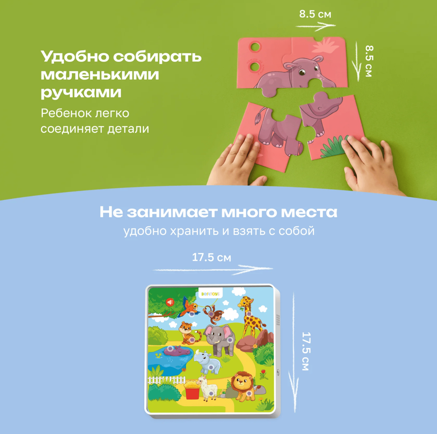 Безопасные материалы: ABS-пластик и картон. Компактный размер: удобно брать с собой. Не требует подключения к интернету или дополнительным устройствам. Способствует развитию памяти, речи и познавательных навыков. Знакомит ребенка с миром животных фермы. Сочетание классической игры-пазла с современными технологиями. Долговечность использования: интересно детям разных возрастов. Простота использования: интуитивно понятно даже маленьким детям.