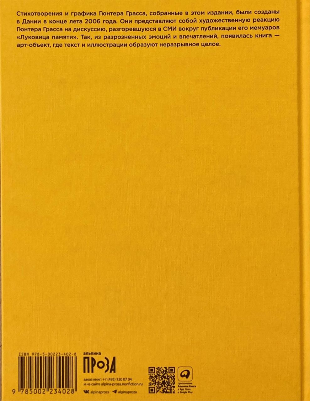 Стихотворения и графика Гюнтера Грасса, собранные в этом томе, были написаны в Дании в конце лета 2006 года. Они представляют собой художественную реакцию Гюнтера Грасса на дискуссию, разгоревшуюся в СМИ вокруг публикации его мемуаров «Луковица памяти». Из разрозненных эмоций и впечатлений Грасс создал книгу как арт-объект, где текст и иллюстрации образуют неразрывное целое.
