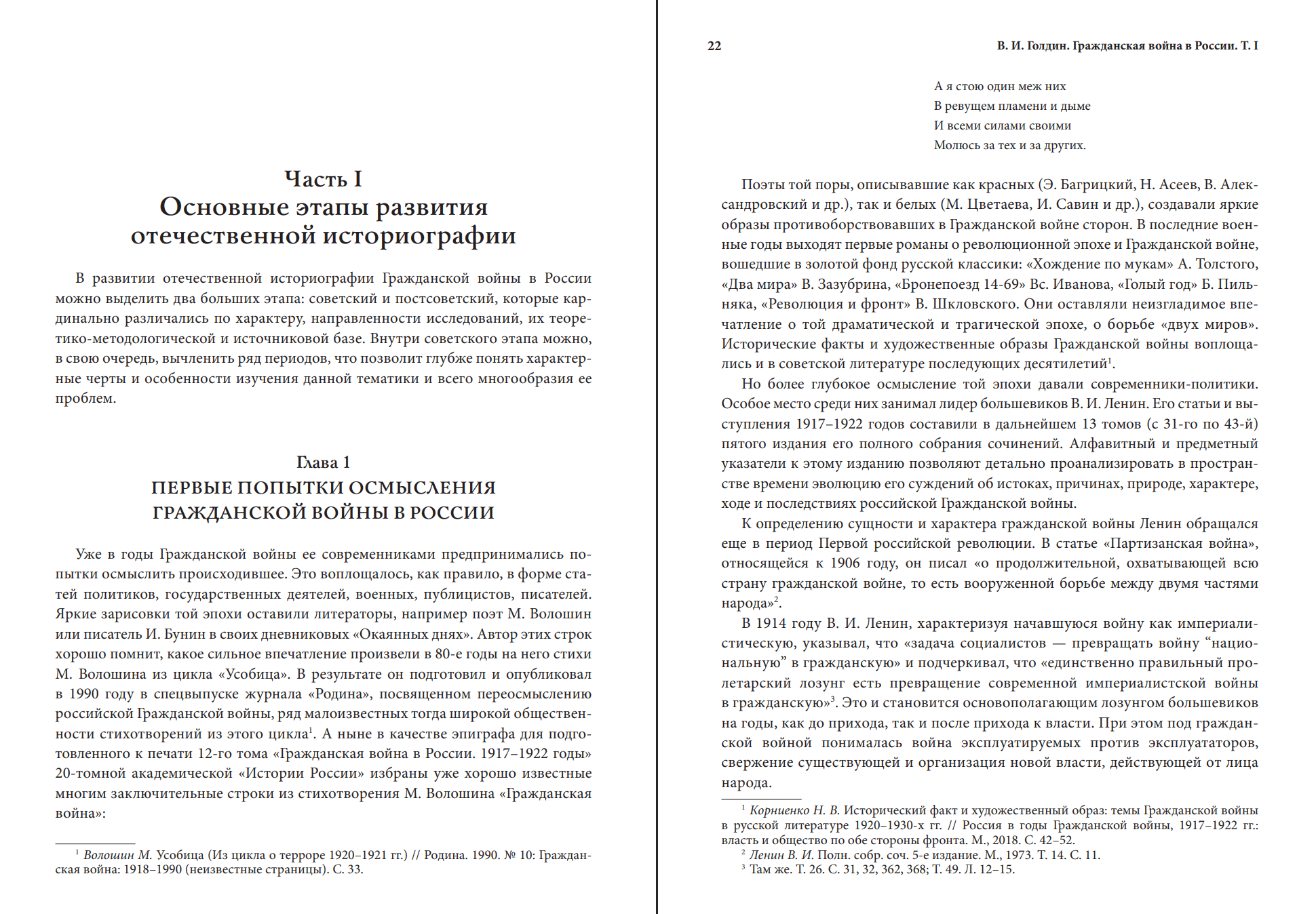 В двухтомной монографии В. И. Голдина представлен всесторонний анализ историографии Гражданской войны в России (1917–1922) за прошедшее со времени ее окончания столетие. Характеризуются процессы изучения войны в отечественной и зарубежной историографии, в эмигрантской литературе.