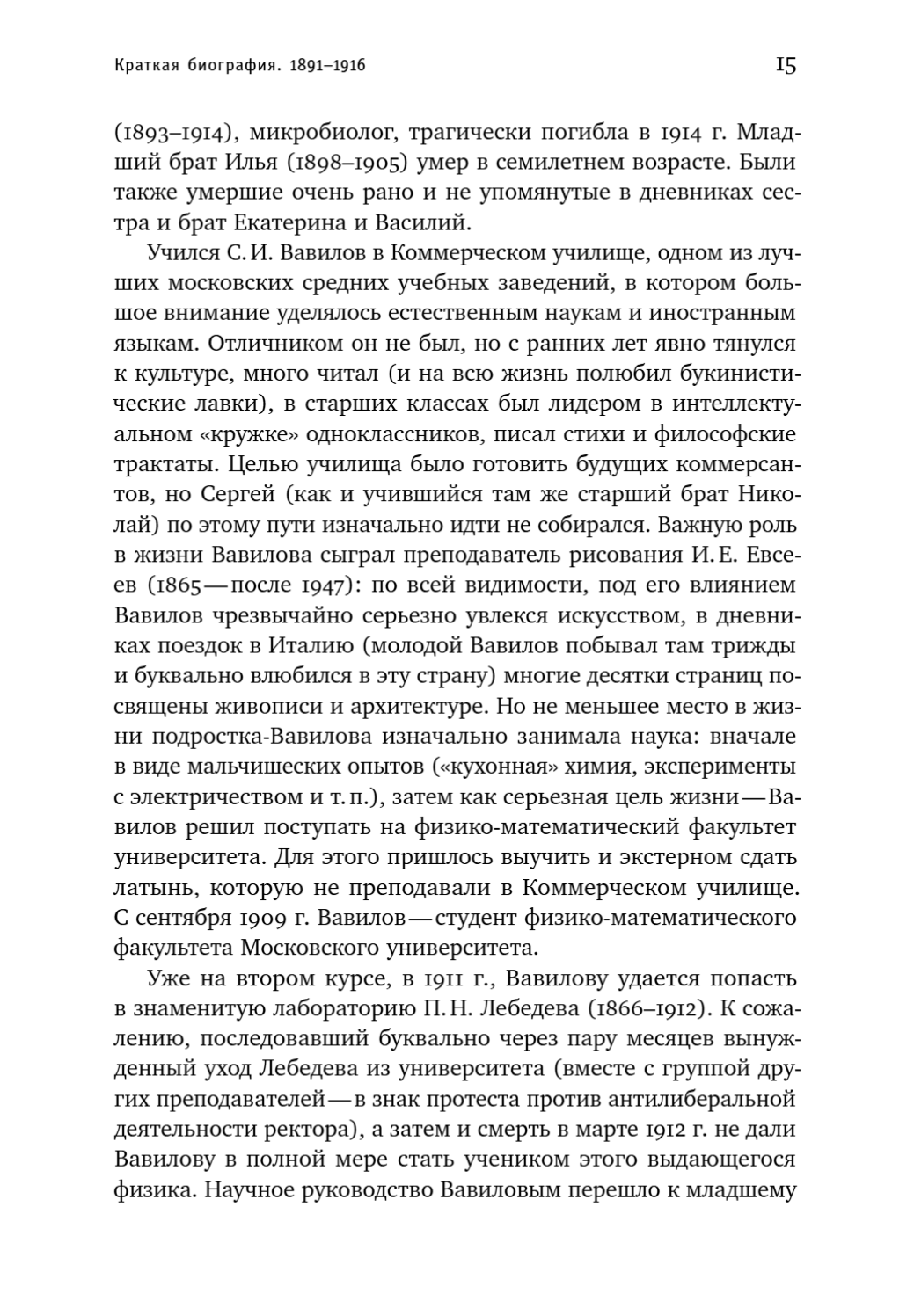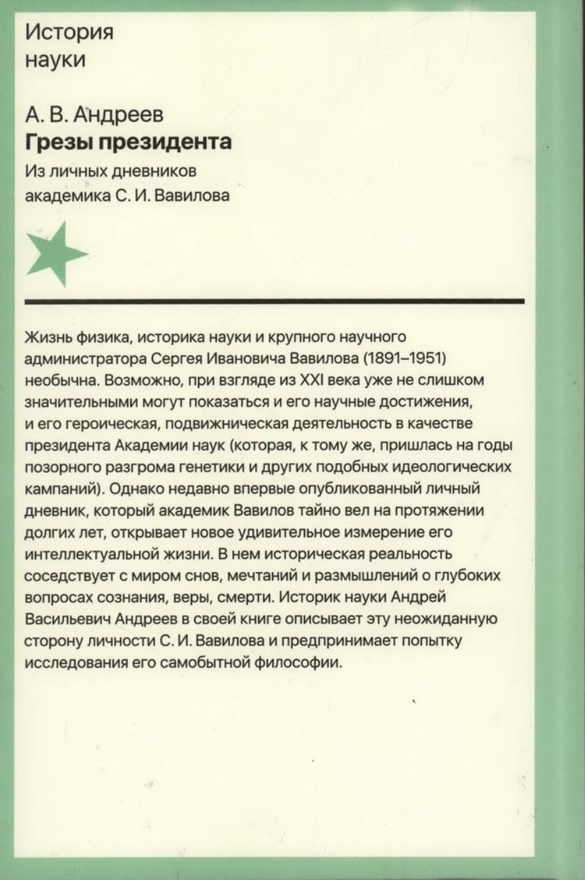 Жизнь физика, историка науки и крупного научного администратора Сергея Ивановича Вавилова (1891–1951) необычна. Возможно, при взгляде из XXI века уже не слишком значительными могут показаться и его научные достижения, и его героическая, подвижническая деятельность в качестве президента Академии наук (которая, к тому же, пришлась на годы позорного разгрома генетики и других подобных идеологических кампаний). Однако недавно впервые опубликованный личный дневник, который академик Вавилов тайно вел на протяжении долгих лет, открывает новое удивительное измерение его интеллектуальной жизни. В нем историческая реальность соседствует с миром снов, мечтаний и размышлений о глубоких вопросах сознания, веры, смерти. Историк науки Андрей Васильевич Андреев в своей книге описывает эту неожиданную сторону личности С. И. Вавилова и предпринимает попытку исследования его самобытной философии.